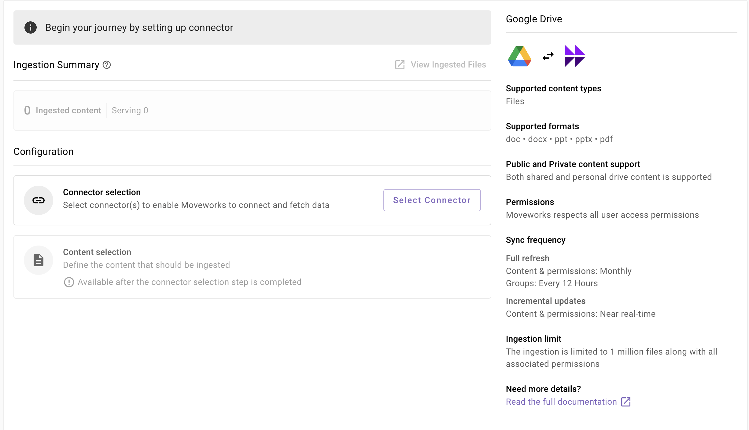 The Google Drive connector for Moveworks supports file-based content including Docs, Slides, and PDFs along with associated metadata such as titles, MIME types, owners, and permissions.