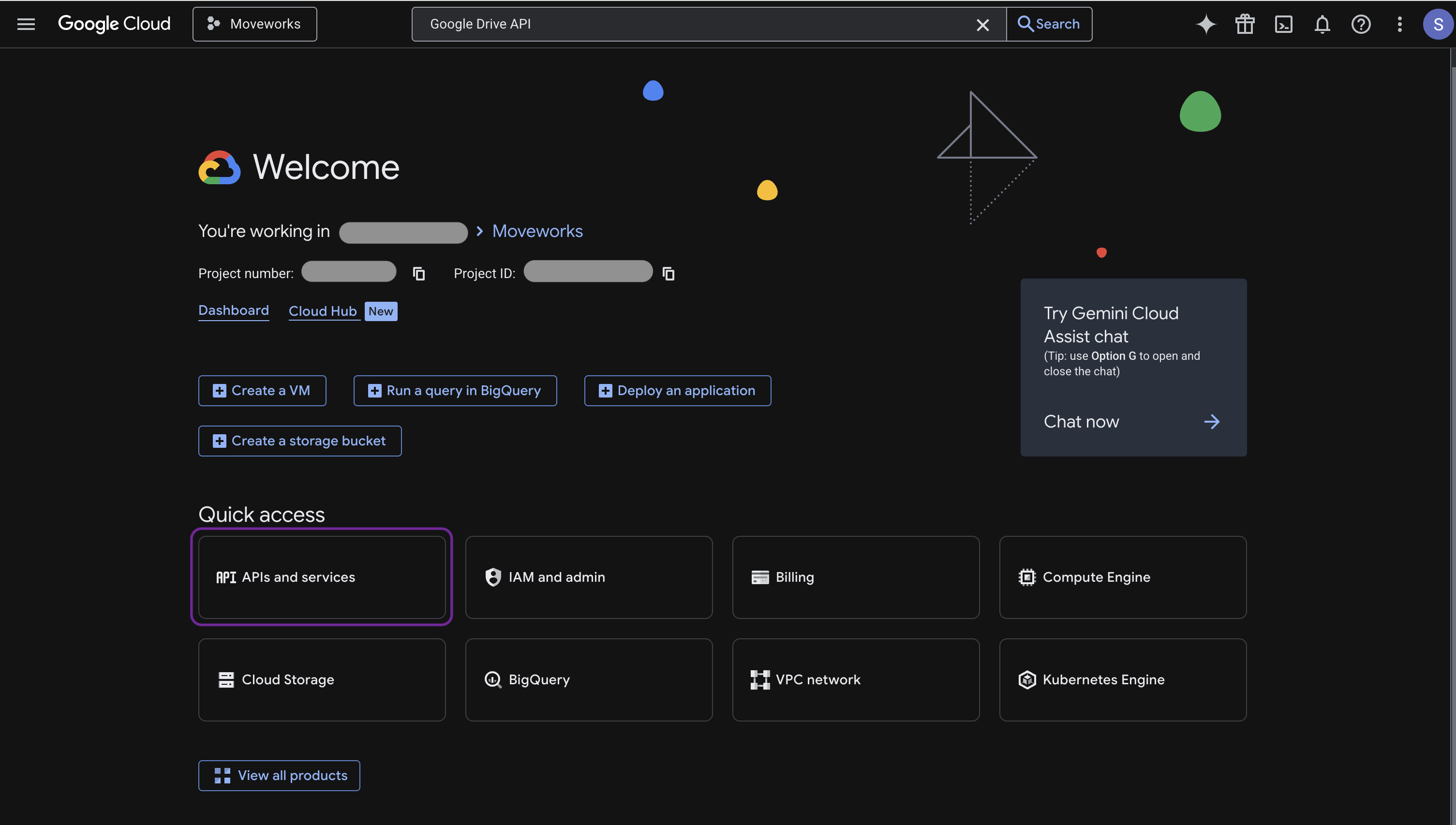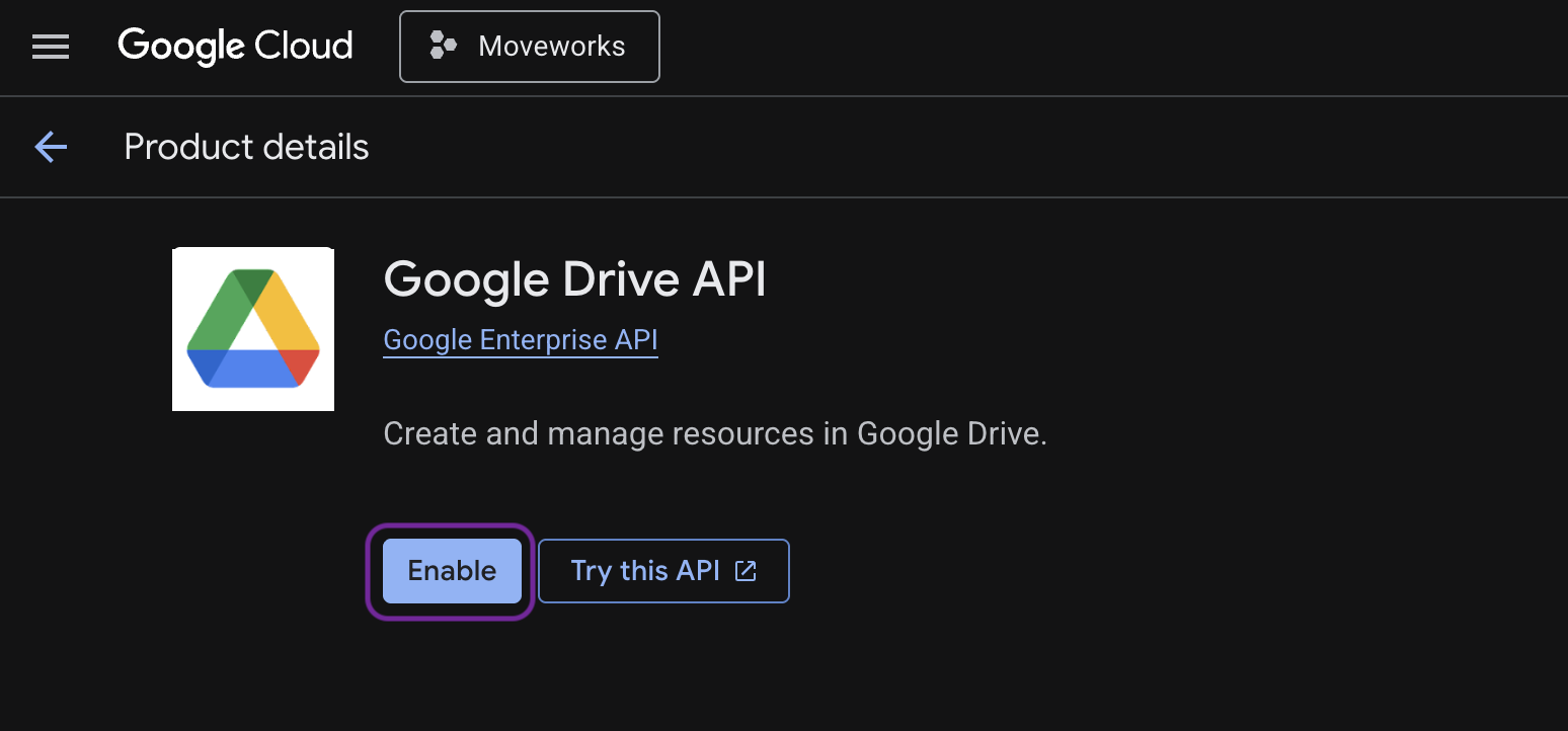 Now that you’ve created your project, the next step is to enable the Google Drive API for it. For all subsequent operations, please make sure you are performing them within the “Moveworks” project, as shown below.