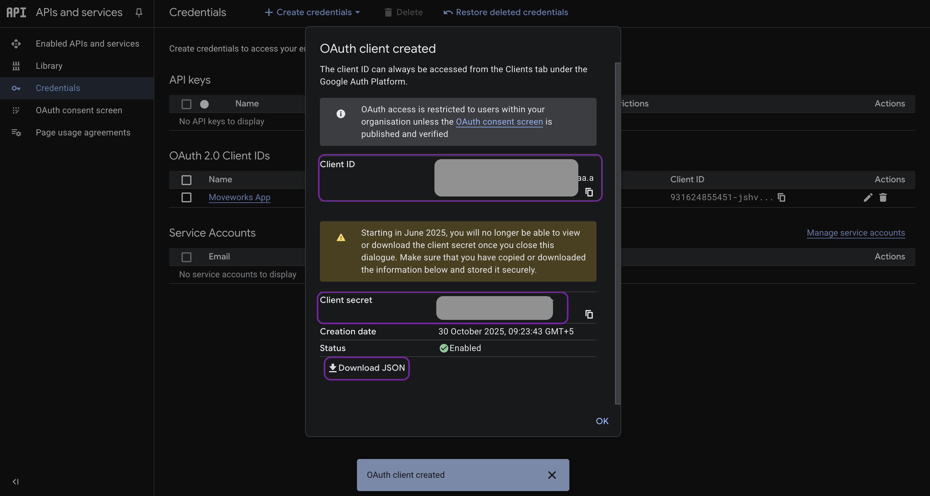 Once complete, a confirmation modal should display your client ID and client secret. Download the JSON file to a secure environment (e.g. your work laptop).
