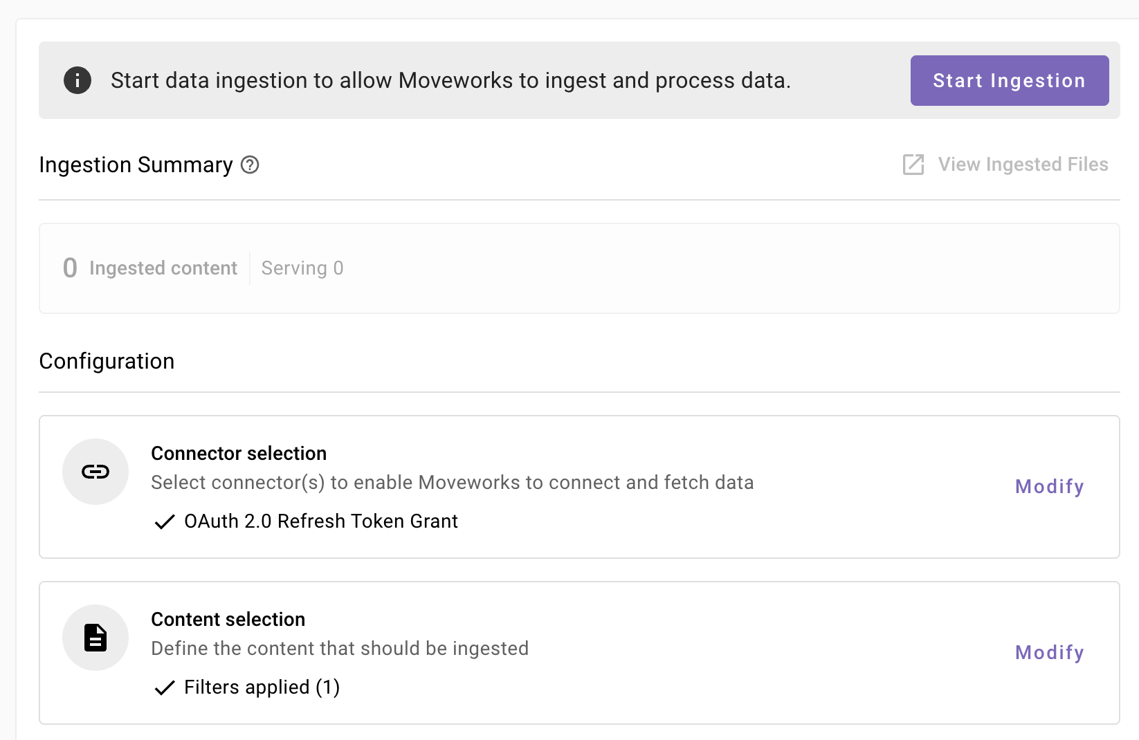 Moveworks supports two authentication methods for connecting to your Google Drive instance—OAuth 2.0 Authorization Code Grant and Service Account without Domain-Wide Delegation. Both methods securely ingest content from Shared Drives; however, Moveworks recommends OAuth 2.0 because it also enables ingestion of private user content with user consent. Choose the option that best aligns with your organization requirements.