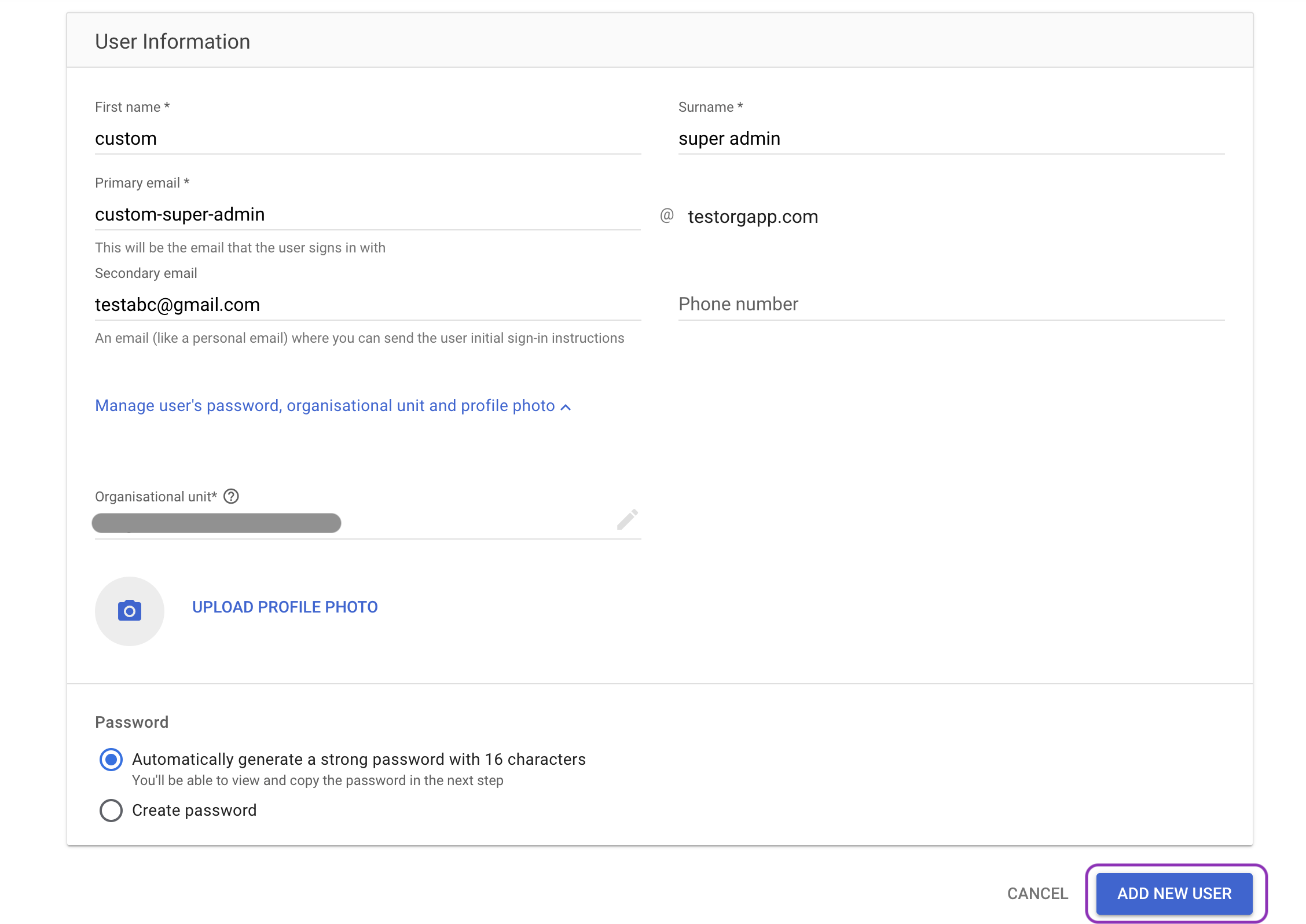 Keep the new user’s sign-in email handy; you’ll assign the Super Admin role in the next step.