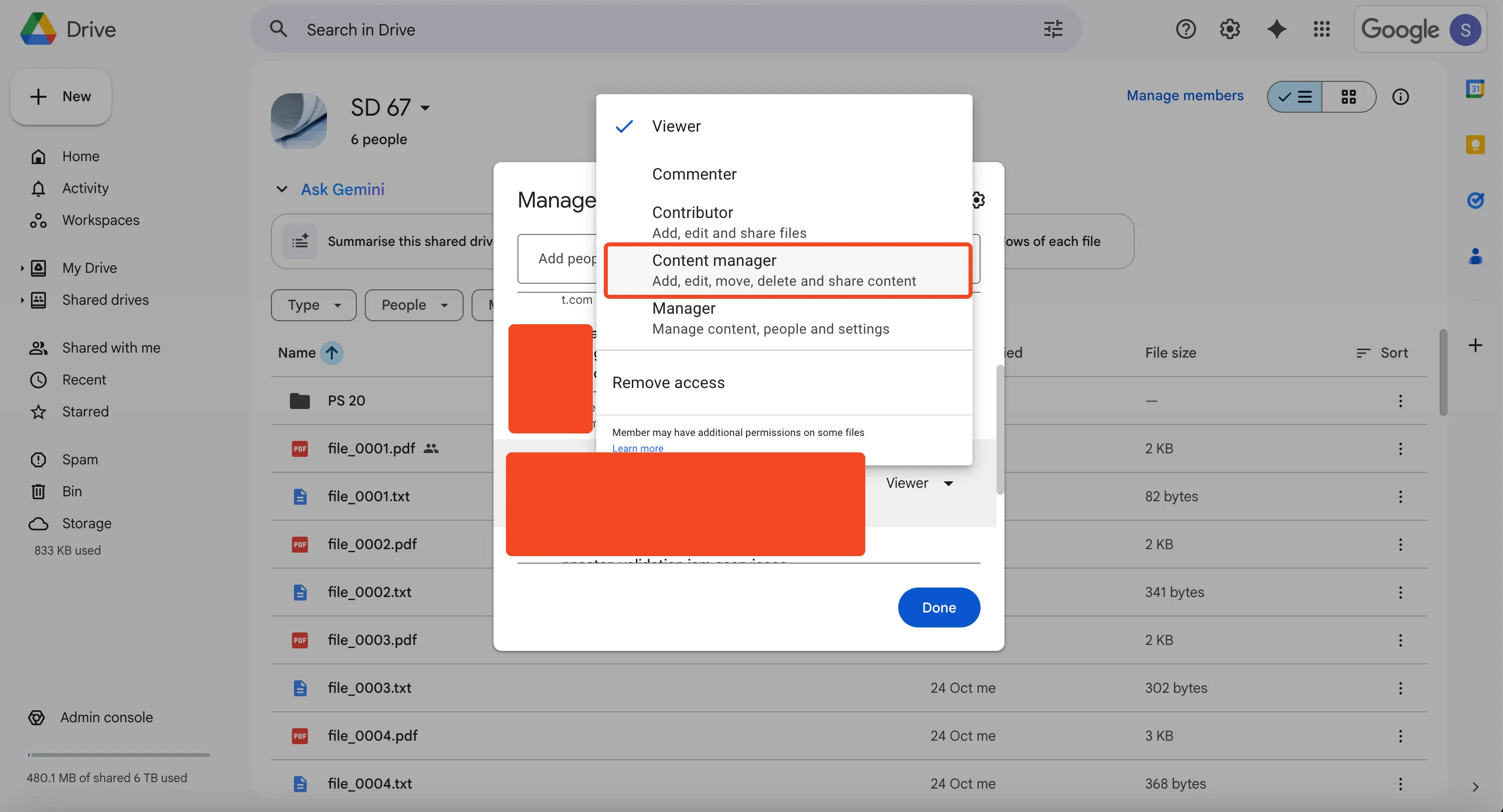 - In Google Drive, for each required Shared Drive, click Manage members, add the Custom Super Admin’s email and assign Content Manager access.