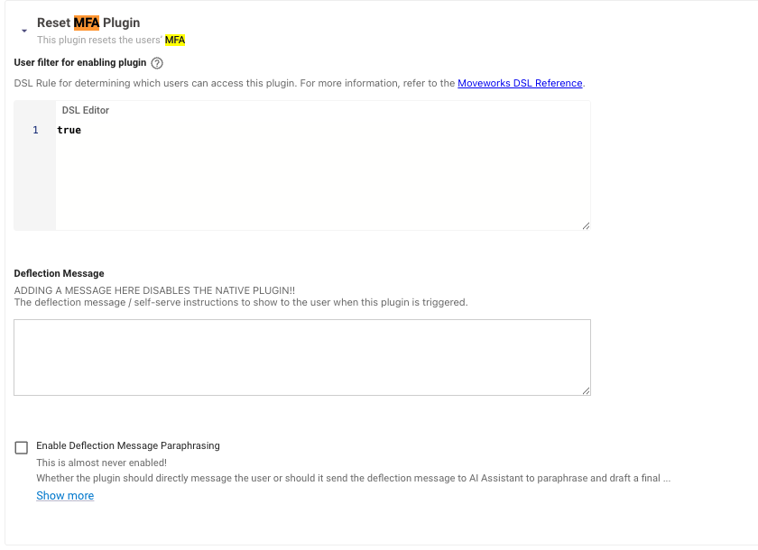 - Please ensure the required Reset MFA Plugin is set to TRUE within the Plugin Management settings. There should be no Deflection Message listed.