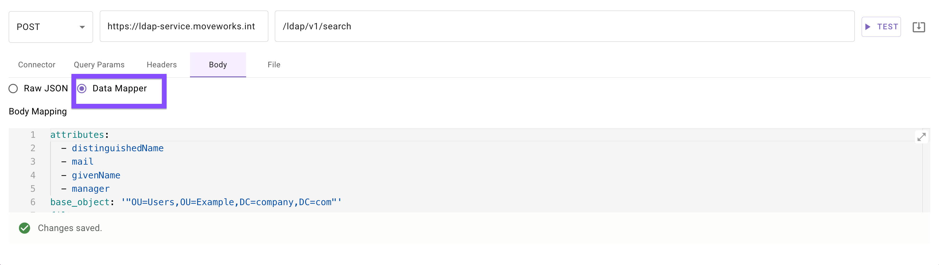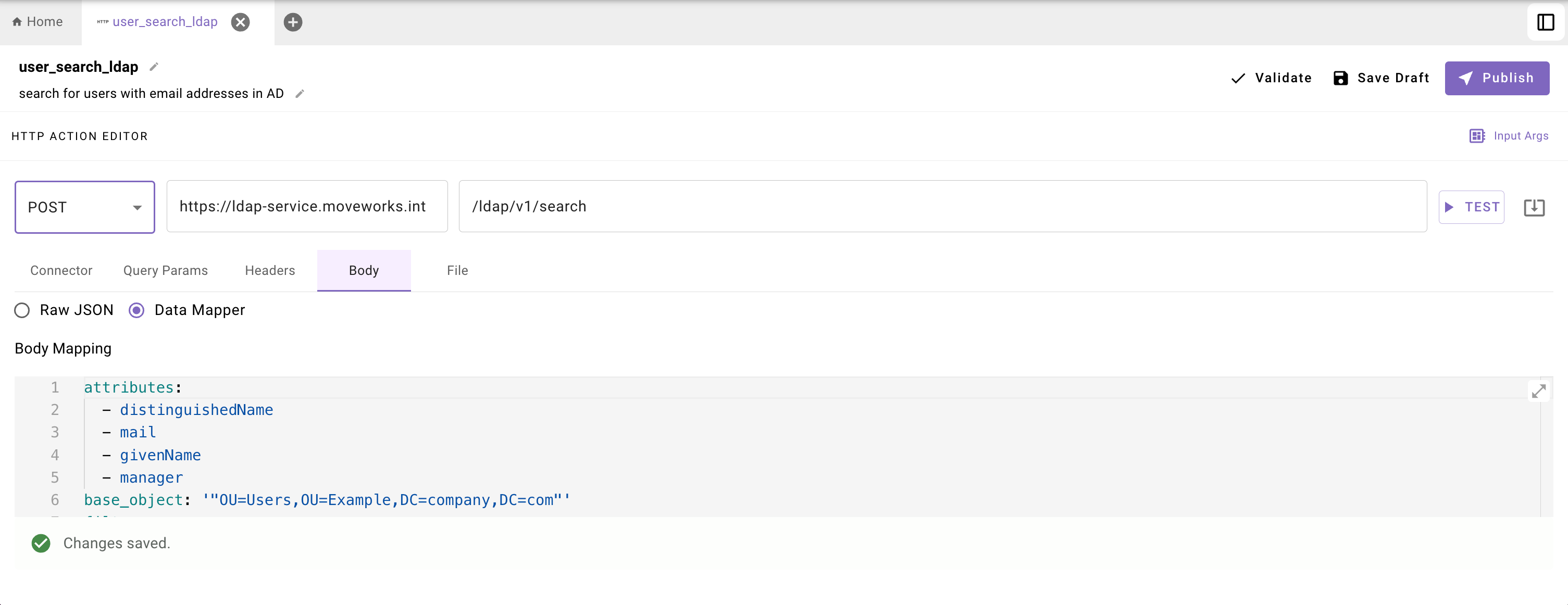 To address this, the LDAP connector supports a filter template + filter arguments pattern that must be configured using the Moveworks Data Mapper functionality in the http body.