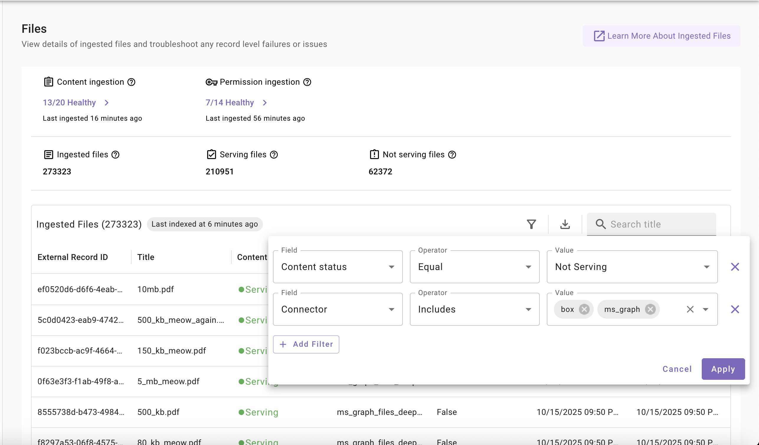 - Connector: Filter files by the connector source to view files from specific connectors (e.g., Google Drive, Box, SharePoint)