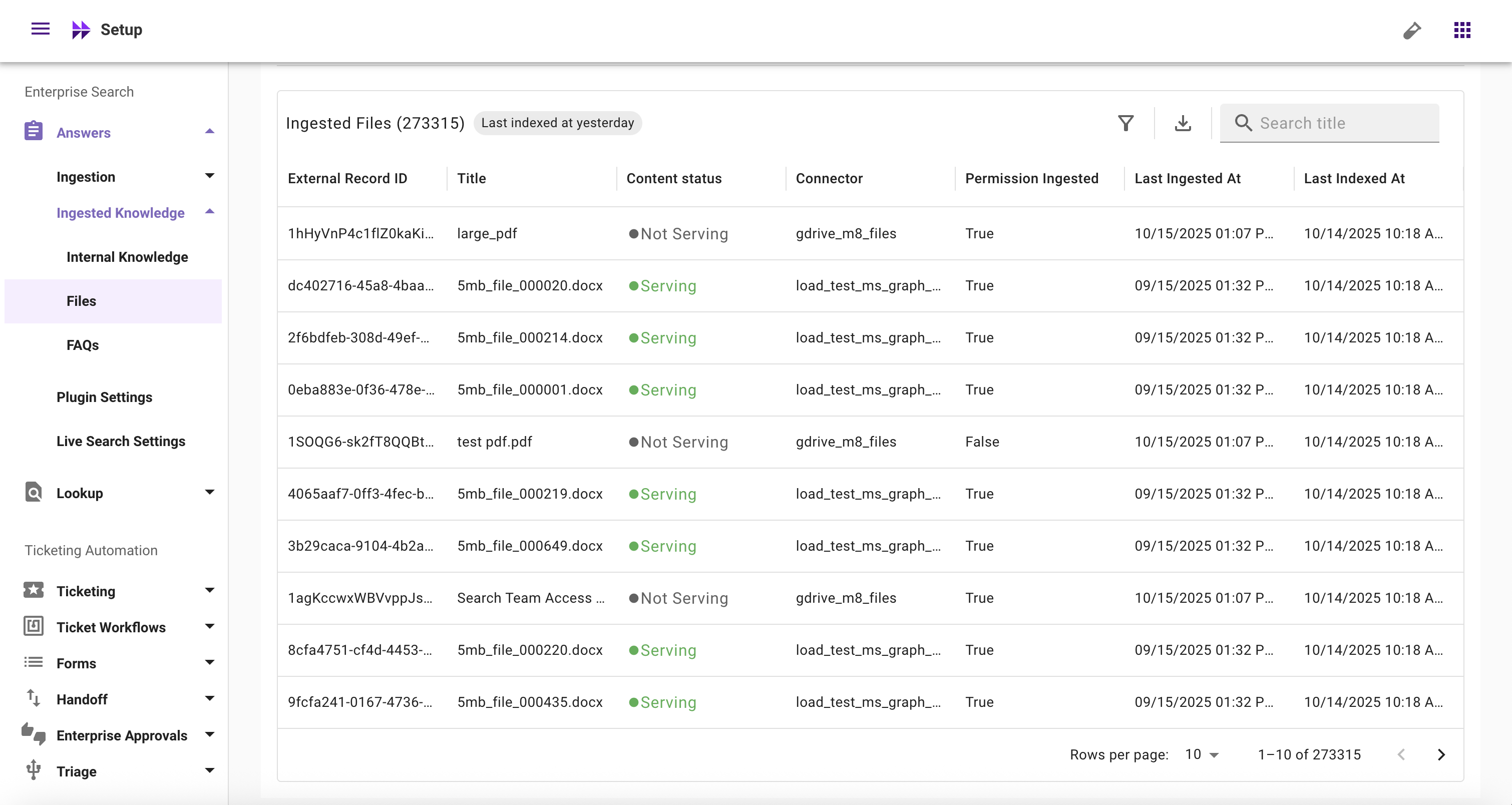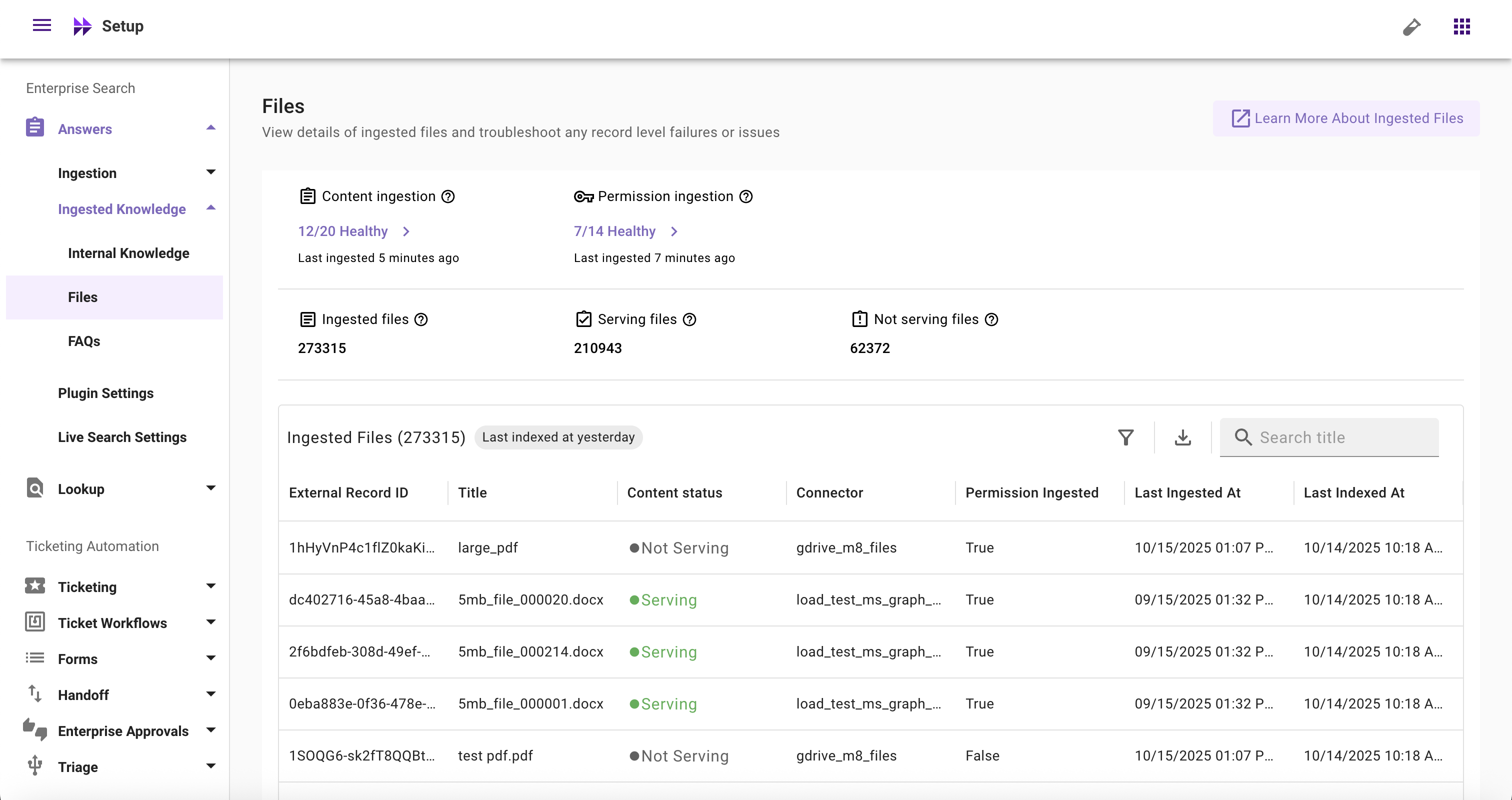 - Content Ingestion: Monitor file ingestion systems' health, view ingestion runs with logs, schedules (full and incremental), and error summaries, and quickly access connector and ingestion configs