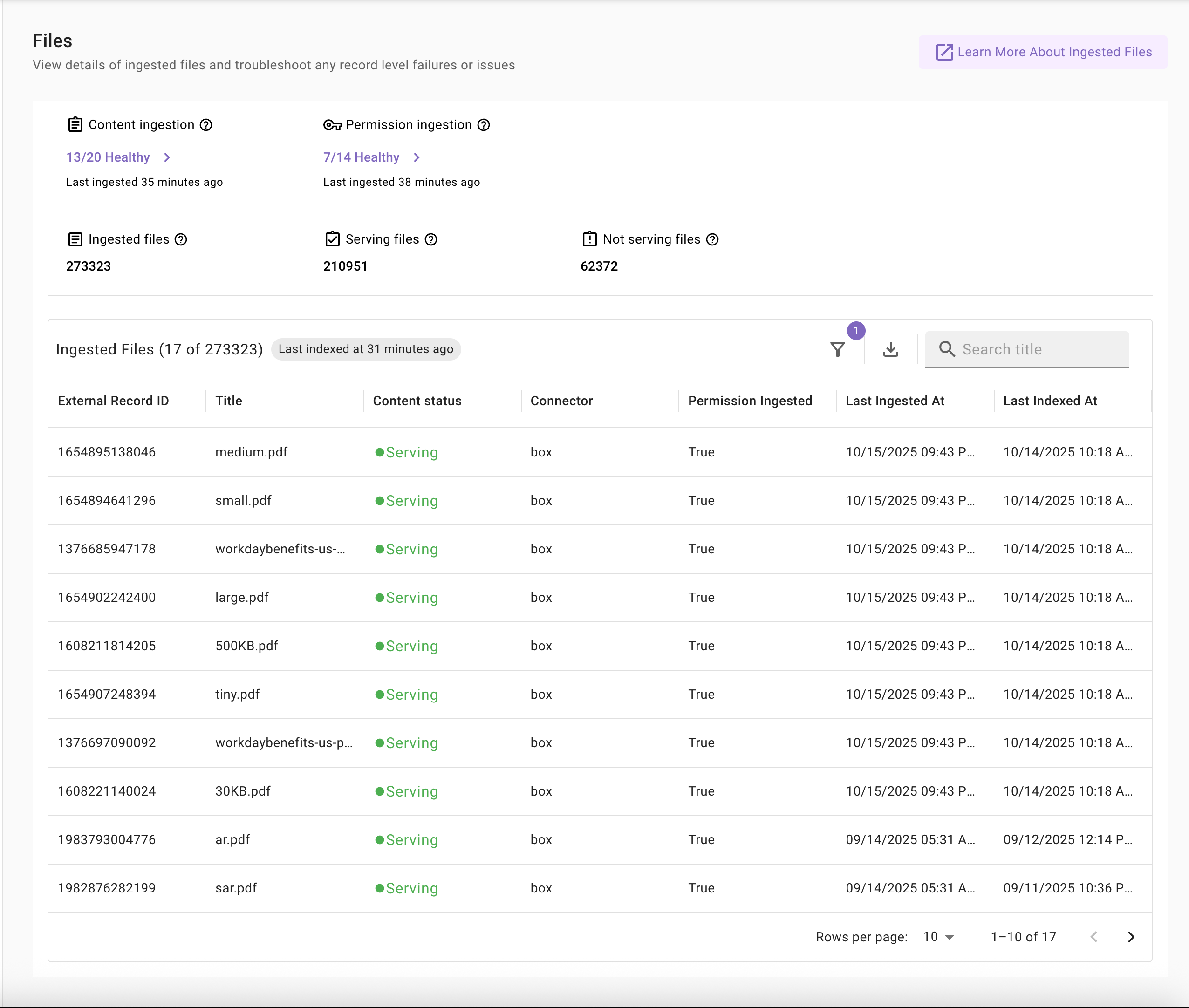 - Permission Ingestion: Monitor permission ingestion systems' health, view ingestion runs with logs, schedules (full and incremental), and error summaries, and quickly access connector and ingestion configs
