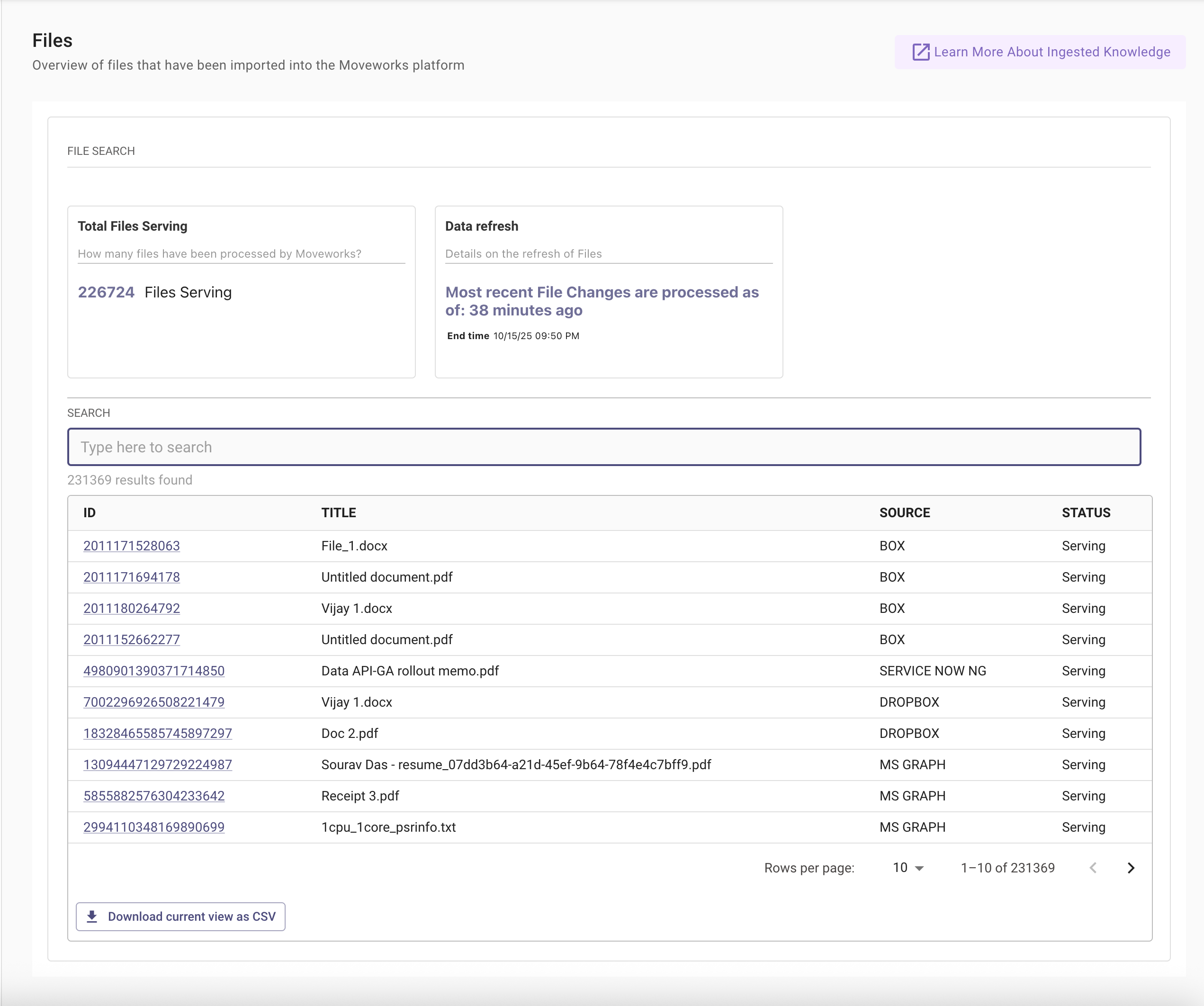 - UAT of newly configured system: Validate if content is getting successfully ingested and indexed into Moveworks. Additionally validate if the count of ingested and serving records from your newly configured system is as per your expectation or not