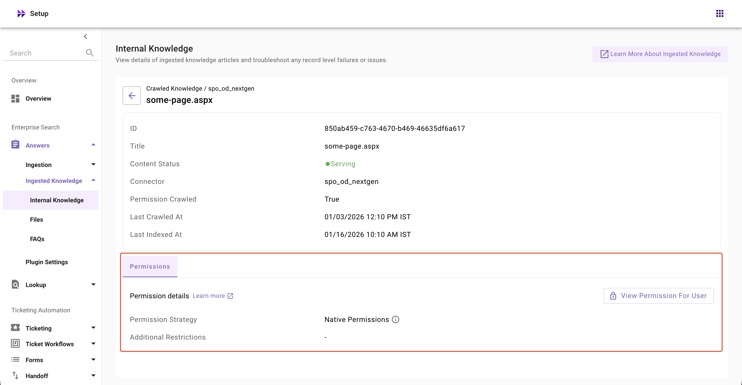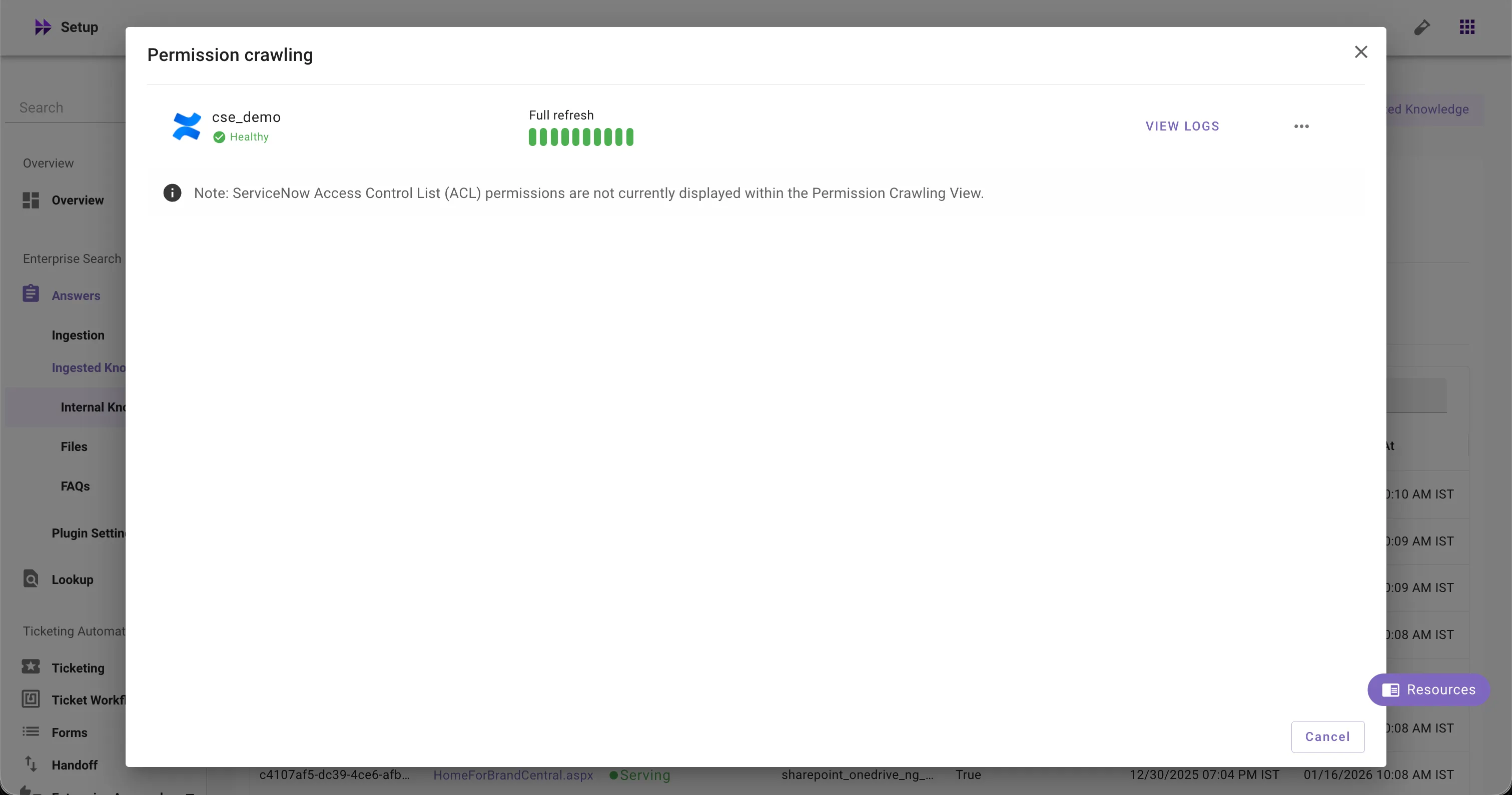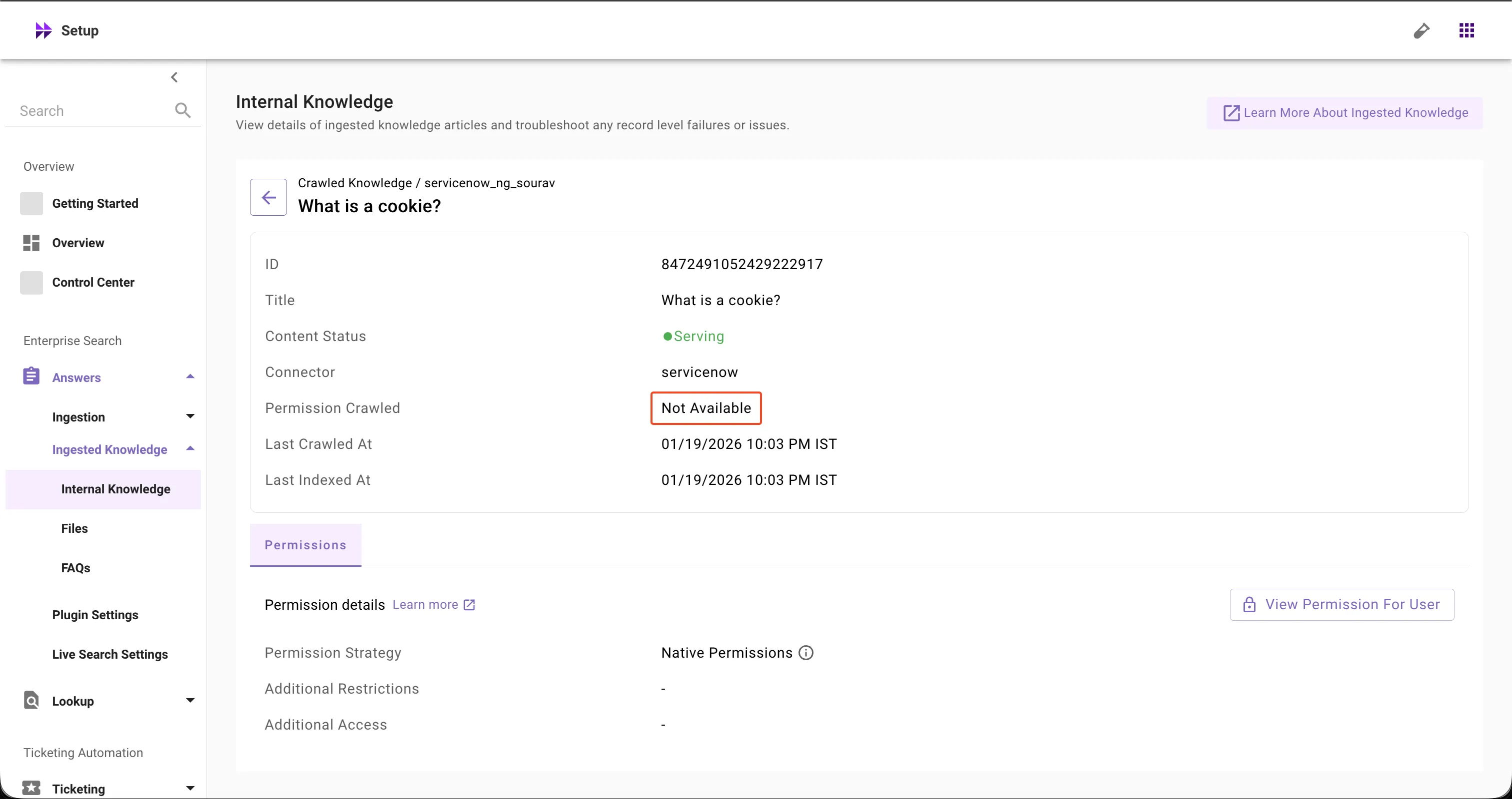 "Permission Ingested: Not Available"?- Currently, this is a known limitation as ServiceNow Access Control List (ACL) permissions are not currently displayed within the Permission Crawling View. The "Not Available" status does not reflect the actual ingestion state of ServiceNow permissions.