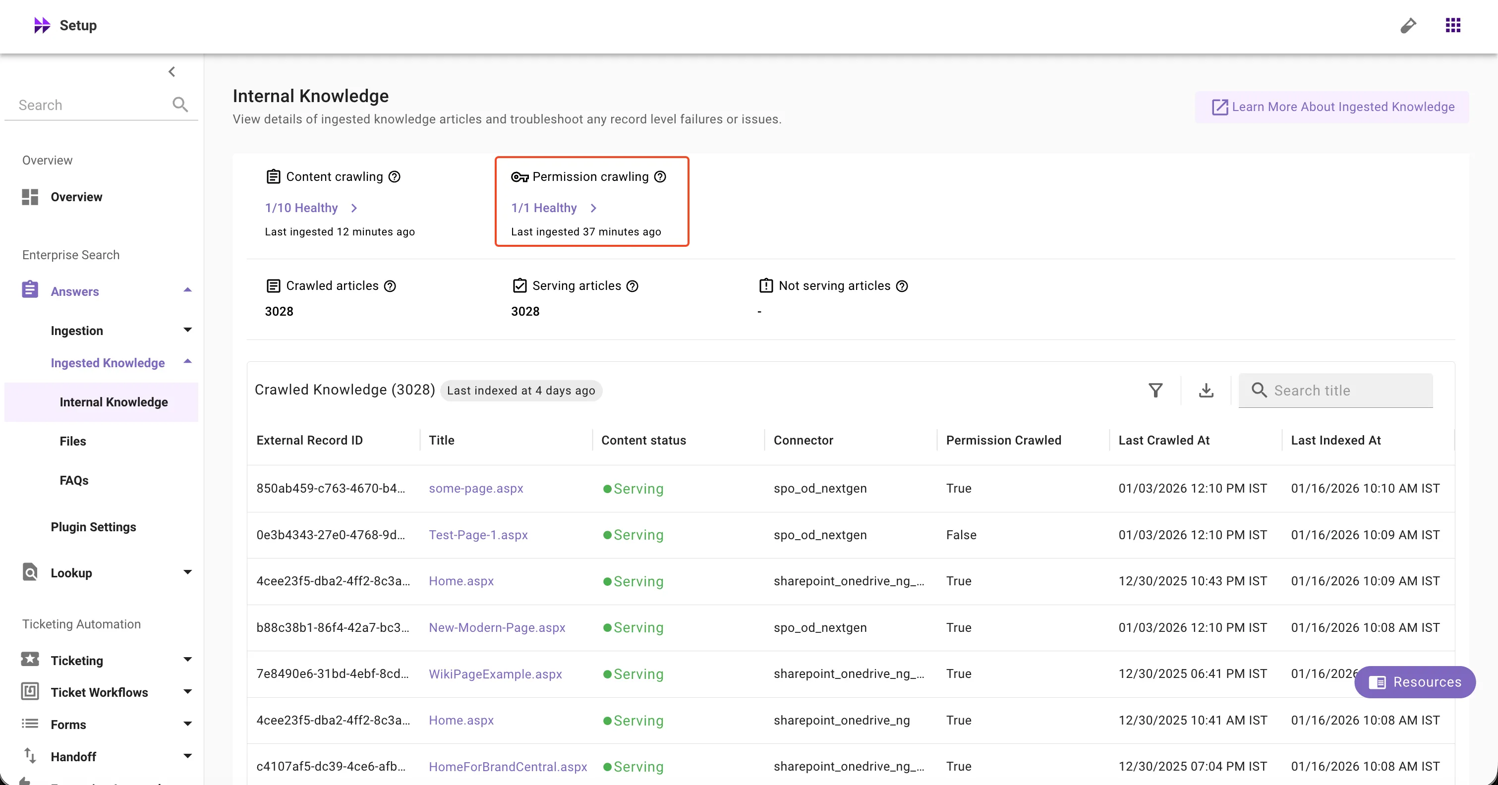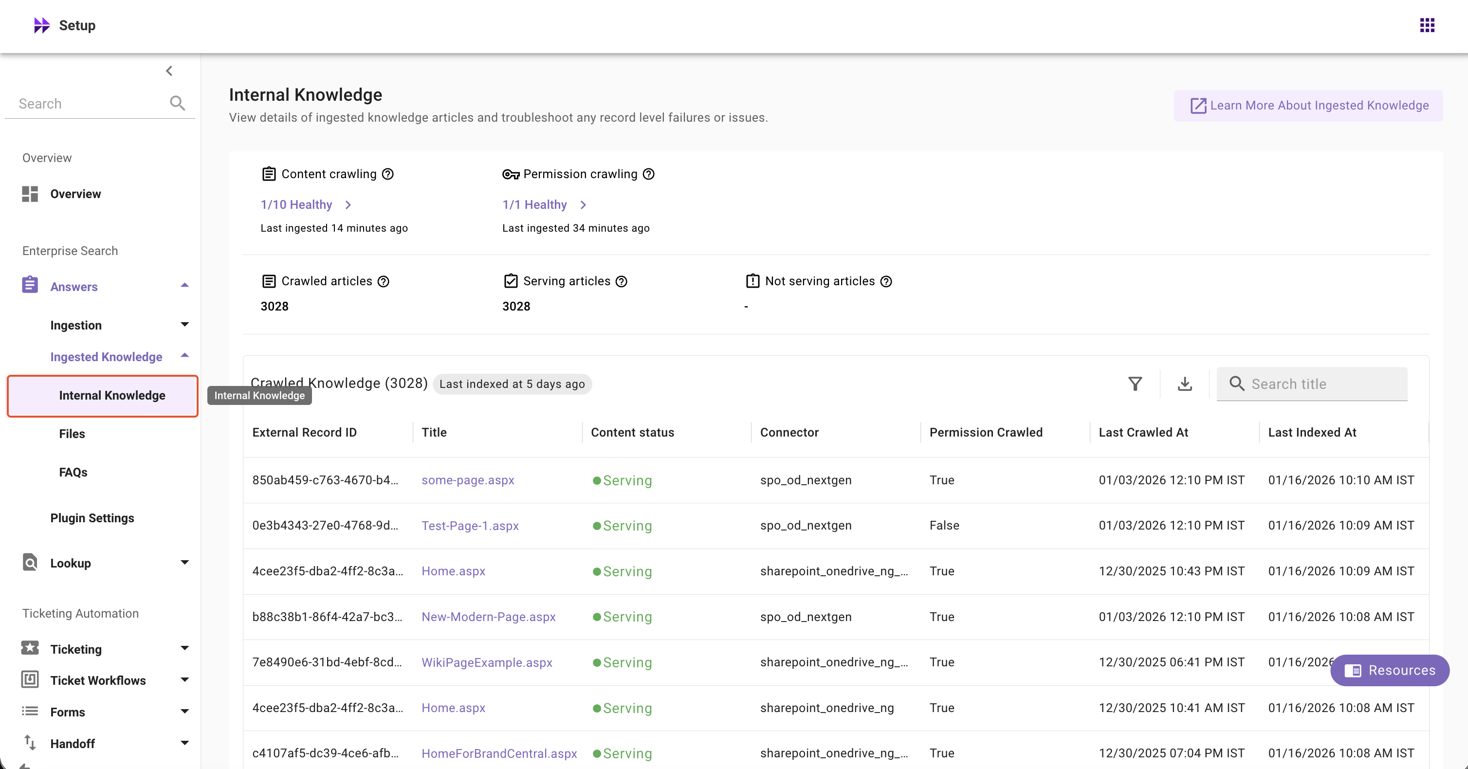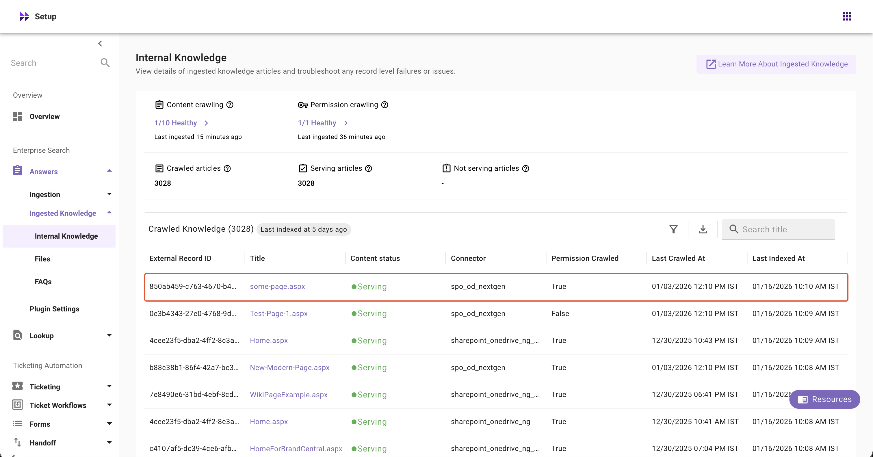 - Troubleshooting: Identify and resolve issues such as unhealthy systems, failed ingestion runs, permission ingestion failures, lower than expected articles count, missing articles, articles not serving to users, and article-level issues