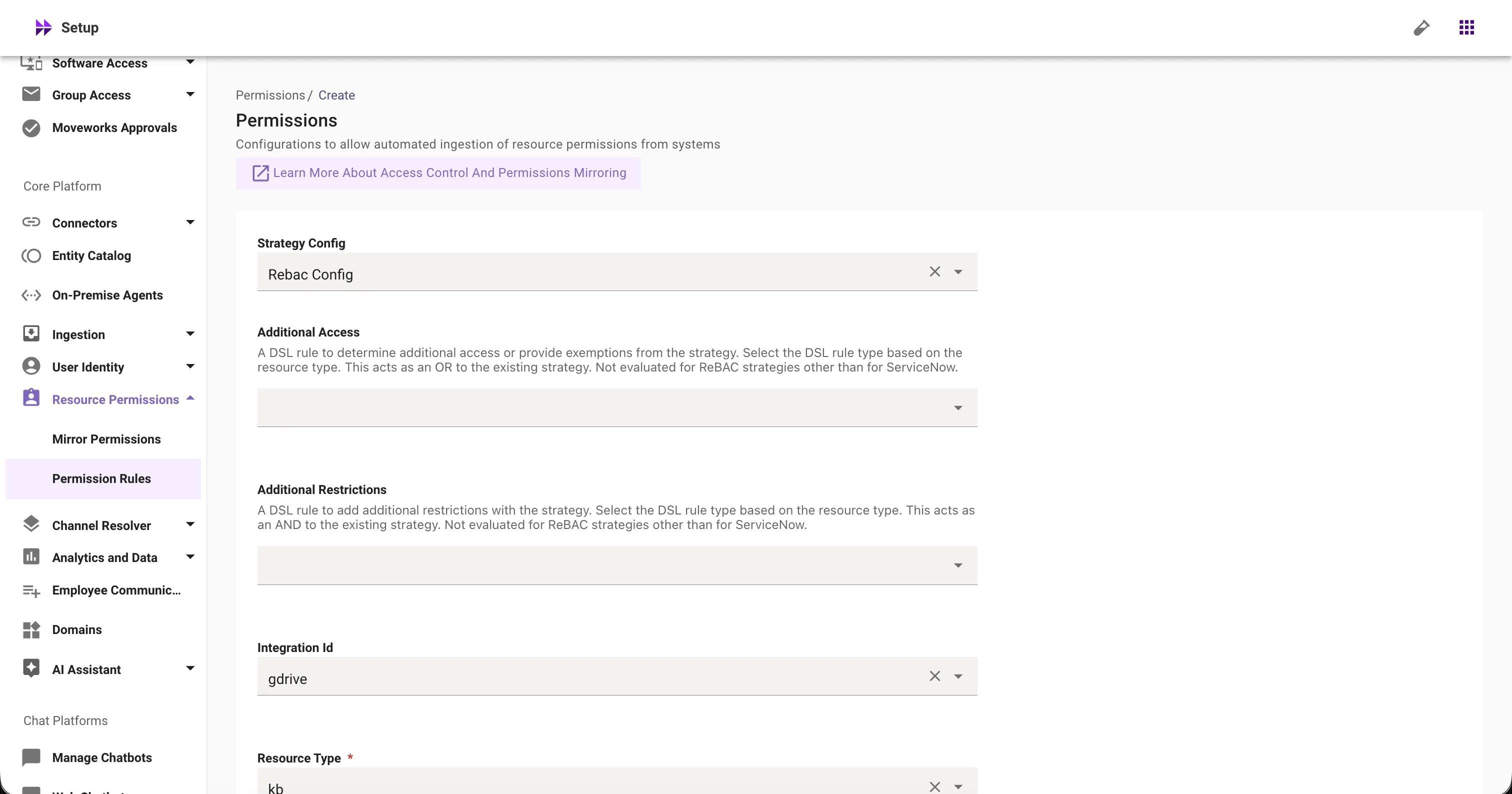 - Additional Access: DSL rules that let Moveworks admins define extra audiences who are allowed to see certain records on top of the existing mirrored permissions. This explicitly adds access rather than restricts it. Configured in Core Platform > Resource Permissions > Permission Rules > Additional Access config.