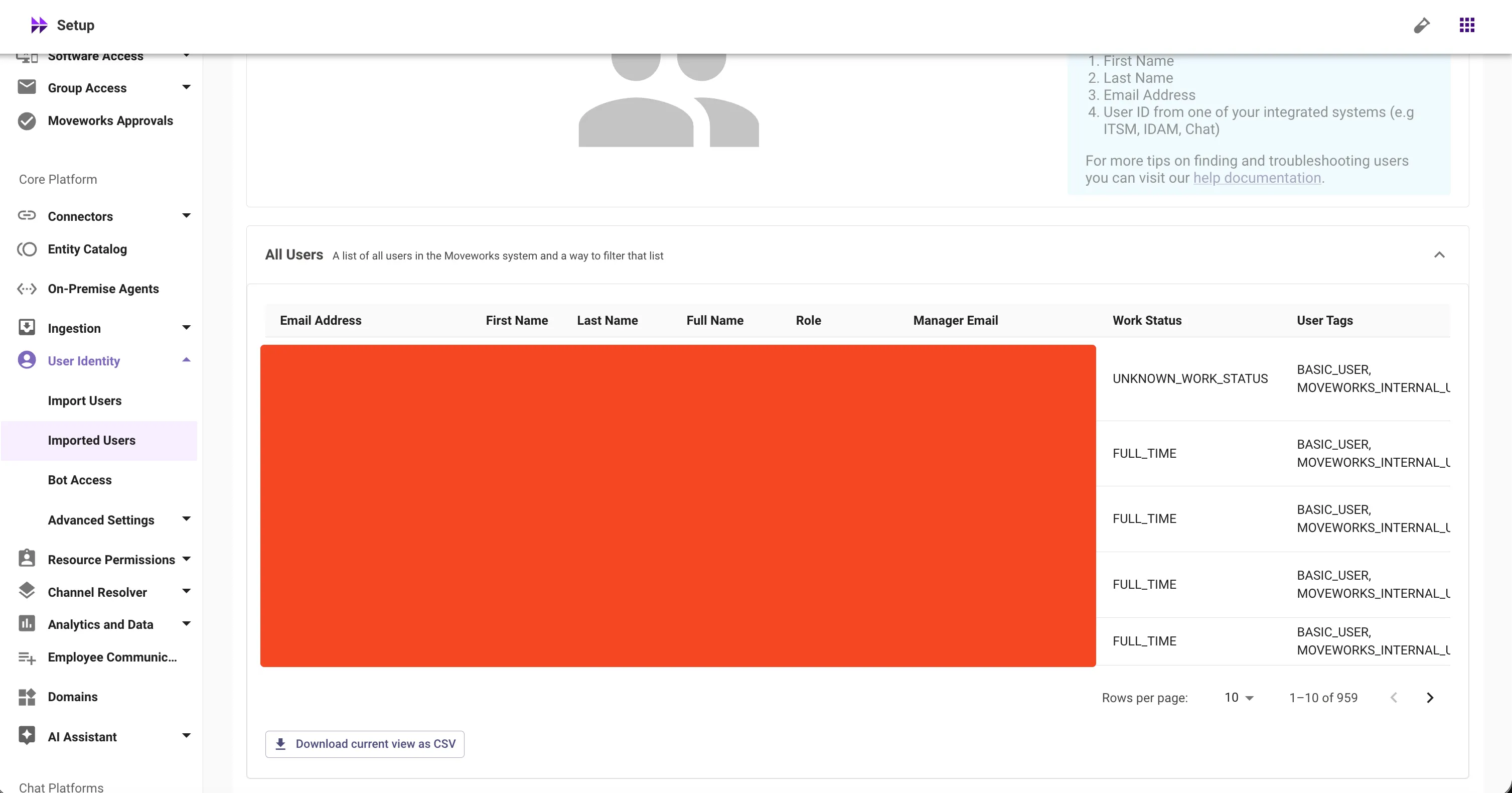 User profile not found. Please verify whether the user exists in Moveworks.: This user doesn't exist in the Moveworks platform to evaluate permissions. Please check whether the user is ingested in User Identity > Imported Users > All Users.