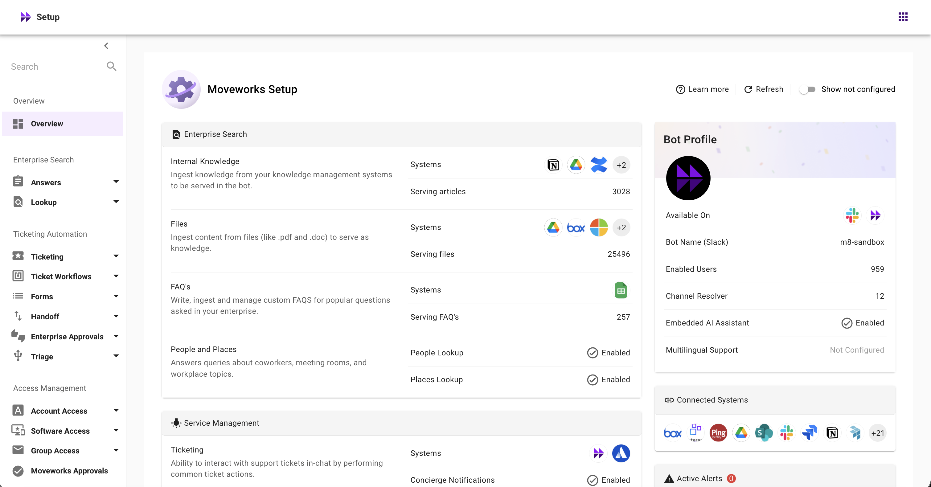 - Connected systems health: Monitor health of connected systems by reviewing whether Moveworks is able to successfully crawl and ingest knowledge from your connected systems