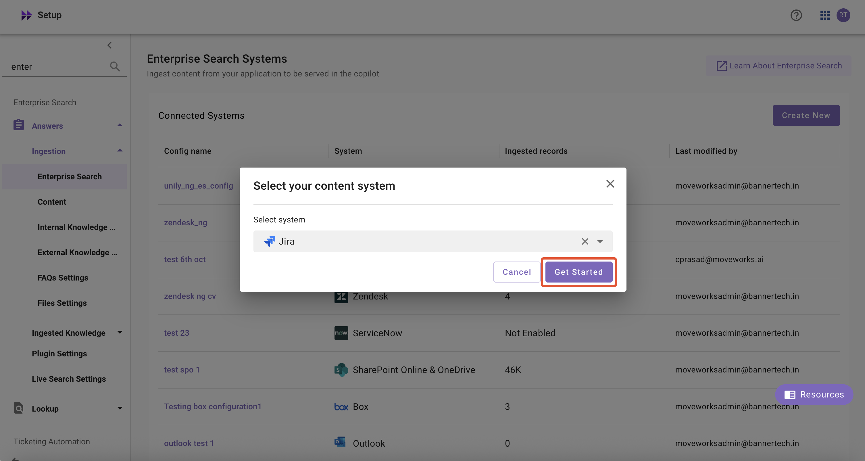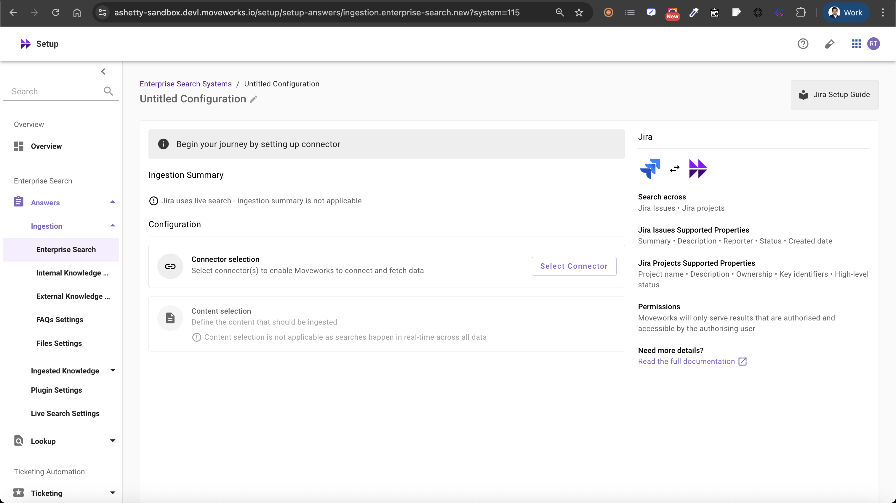 Navigate to Moveworks Setup > Answers > Ingestion > Enterprise Search