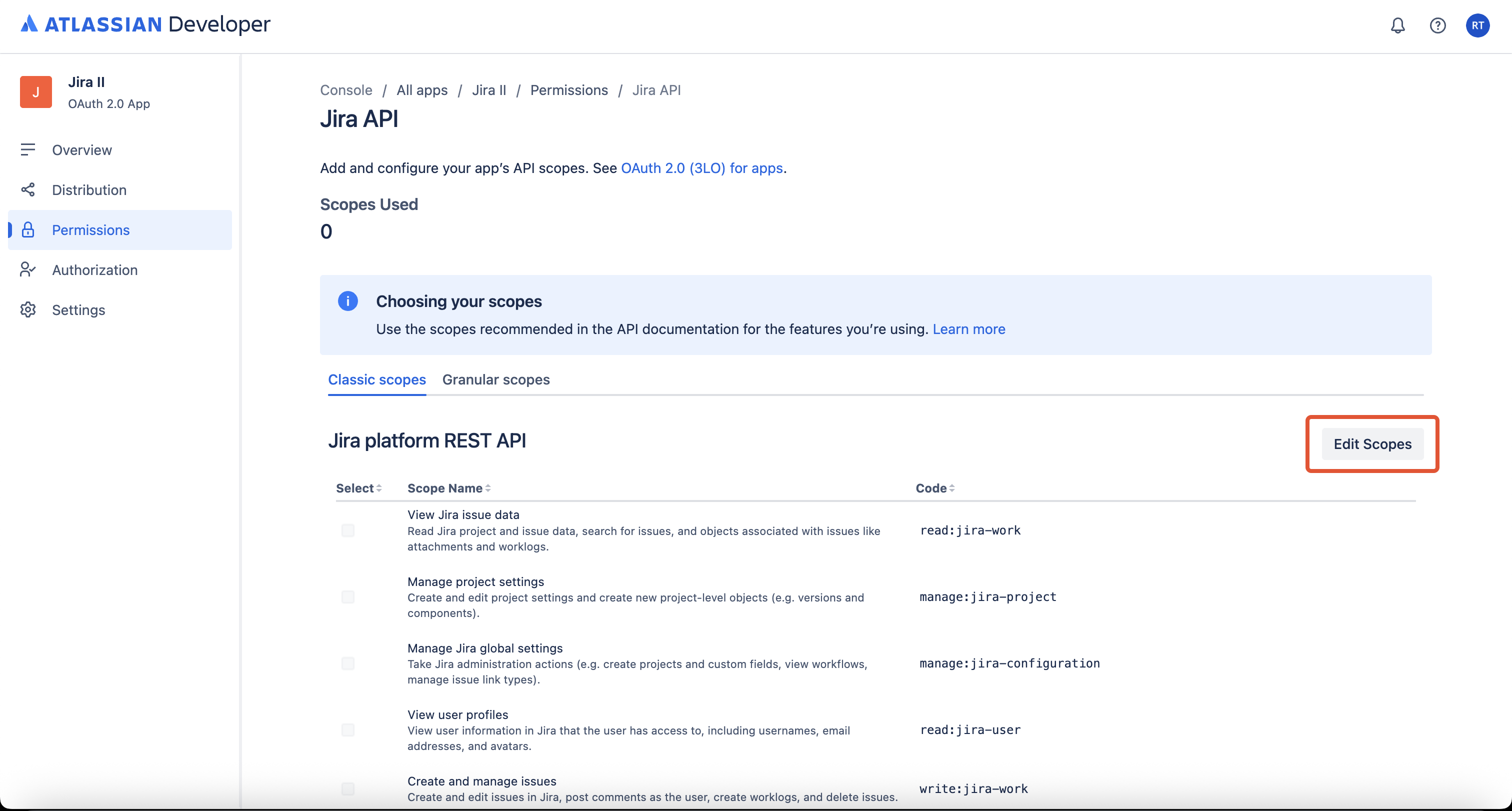 Under the Jira Classic scopes tab, click on the Edit Scopes button