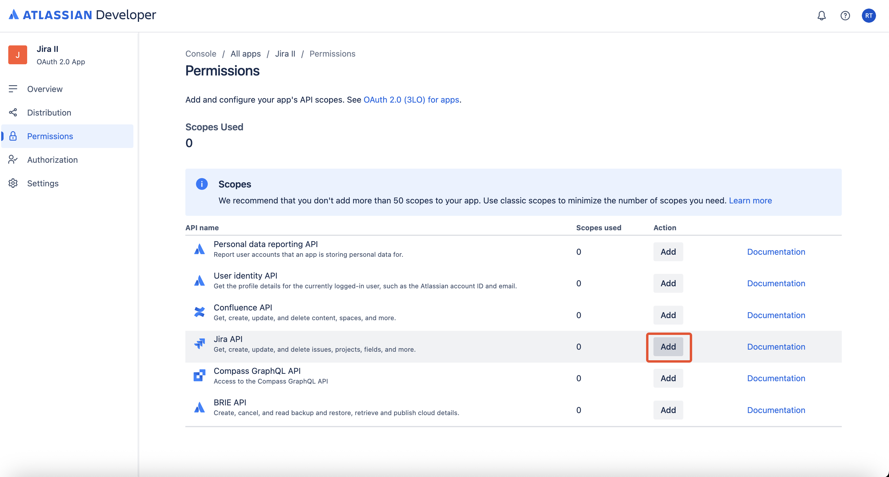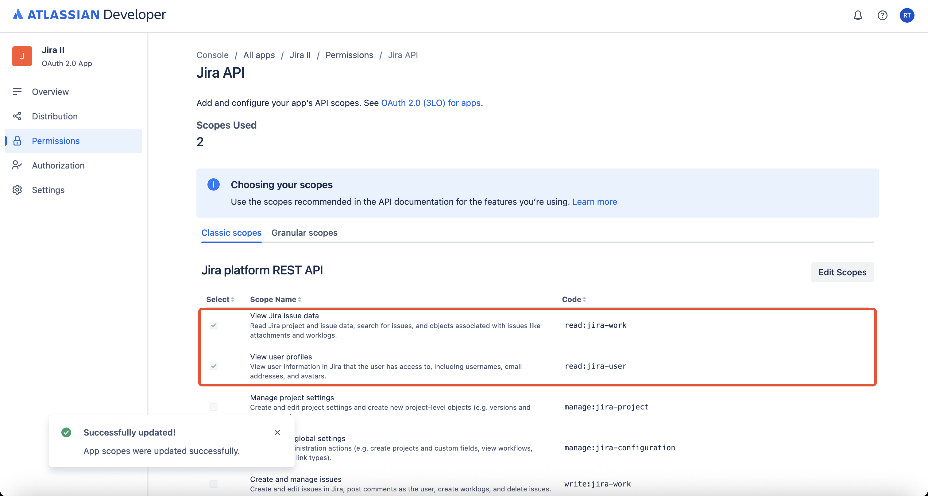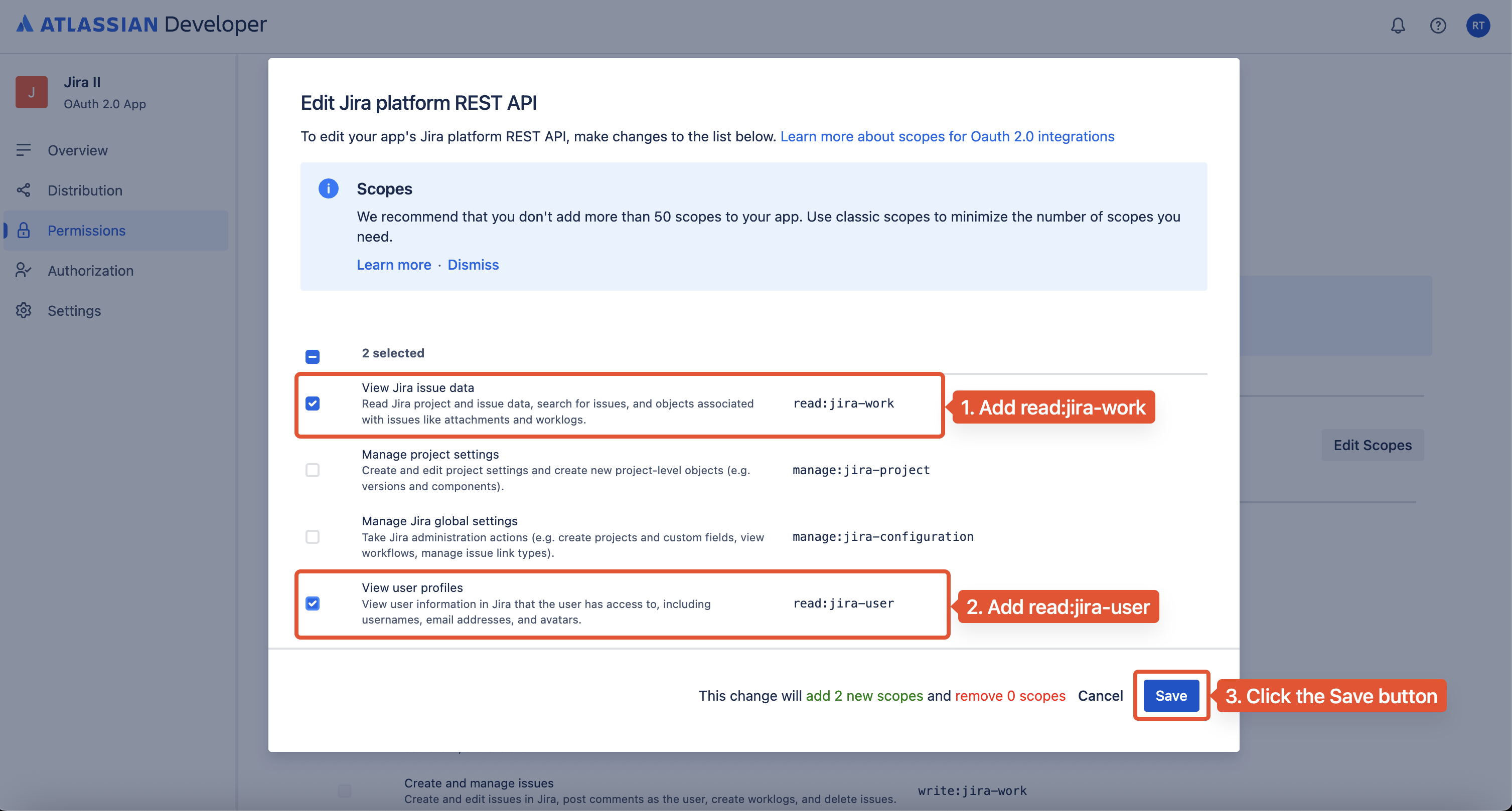read:jira-workandread:jira-userscopes, and Click on the Save button