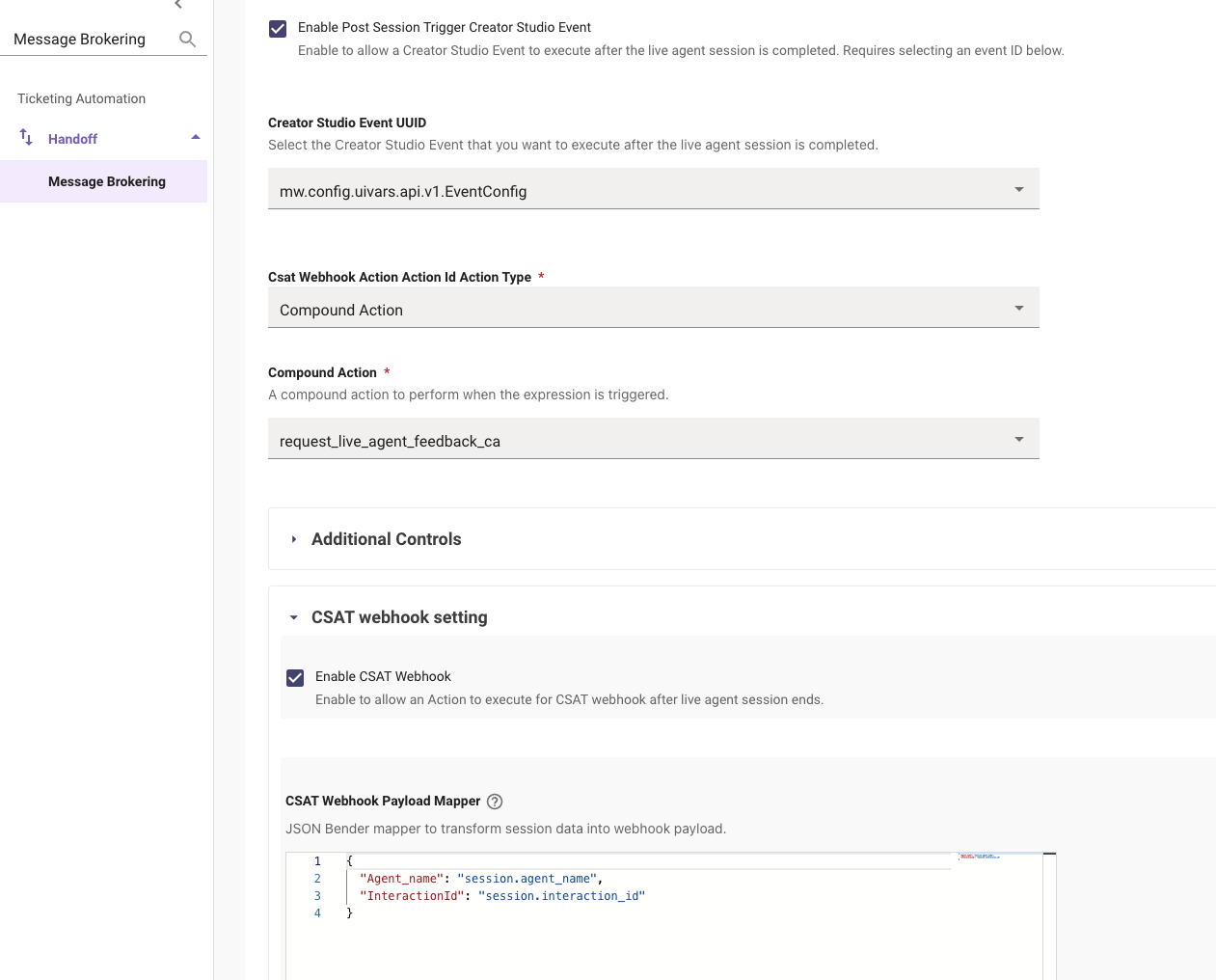 - Select the specific action to configure. For example a "Compound Action" would enable the CSAT and Transcript flow.