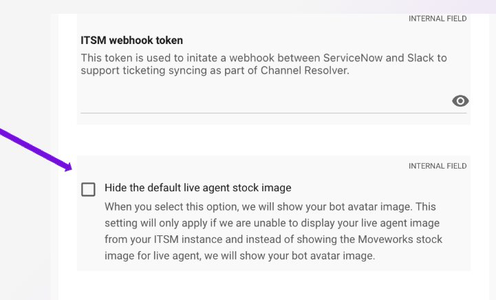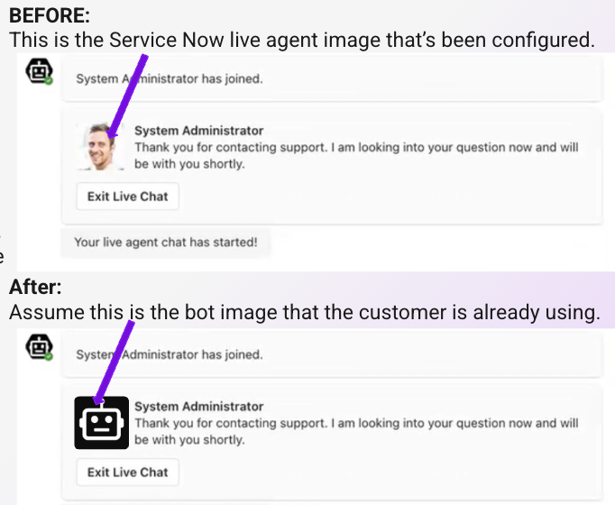 - [Service Now specific config] Using your assistant image (AKA bot image) instead of the image you've configured within Service Now: This new configuration option is only available for Service Now live agent customers. If you are having issues displaying the live agent avatar image thatās been configured within ServiceNow, you can now decide to use your assistant image as the default image.