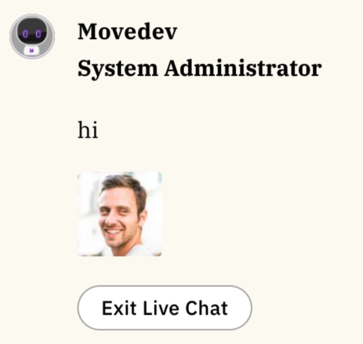 Each message will contain the name of the agent, pulled from that agentās profile in the external system. In the case pictured here, the agentās first and last name is āMoveworks ITā as defined in his ServiceNow user profile. The agentās image can also be pulled from the external system and displayed to the user. However, this is optional and can be disabled. You may choose to disable this for anonymity purposes, because you do not have agent pictures, or because the images are not accessible to Moveworks via API (e.g. hosted behind a company VPN).