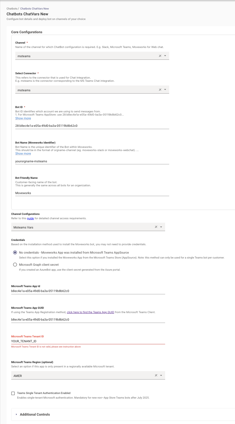 Navigate to Moveworks Setup Portal. Go to Core Platform > Manage Connectors > Built-in Connectors and select Microsoft Teams.