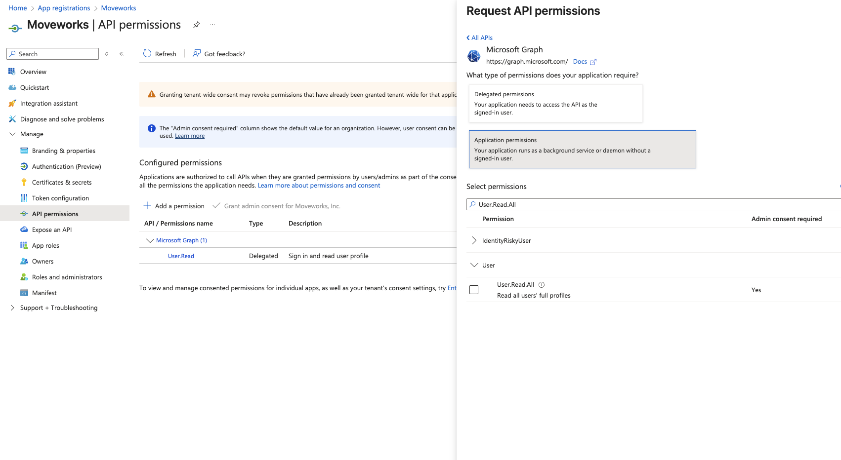 - Go to Manage > API permissions. Select Add a permission and choose Microsoft Graph
