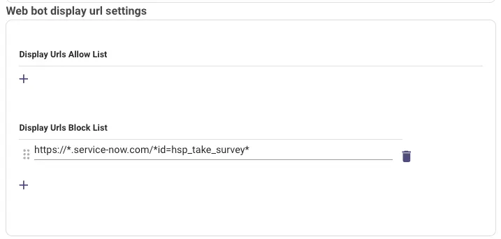 The reverse logic would apply for the “Display Urls Block List”. If you add urls to the list of “Display Urls Block List” section, we WILL NOT show the embedded assistant in those urls that you’ve specified.