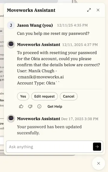 Embedded AI Assistant is a web-based, embedded chat client that can be hosted in your most frequented employee service portals and intranet sites. It automatically authenticates users by using their existing session on the host site, to grant them access to the full capabilities of the Moveworks platform without leaving their browser.