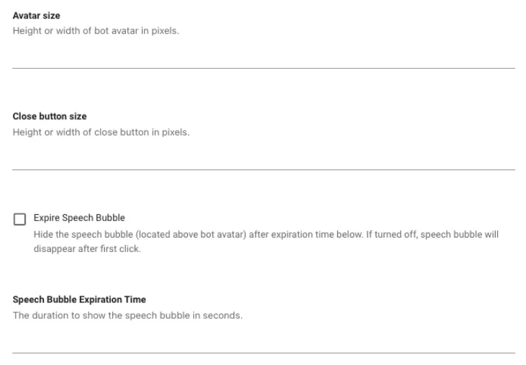 Avatar image:This is the image that will be used as your avatar.Avatar Size:This controls the size of your avatar, specifically how large it appears when it’s displayed as the entry point.Close button size:This is also related to the entry point.Expire Speech Bubble:If you’d like to hide the speech button that says, “how can I help you?” after a specific time this is where you would specify that timeframe.