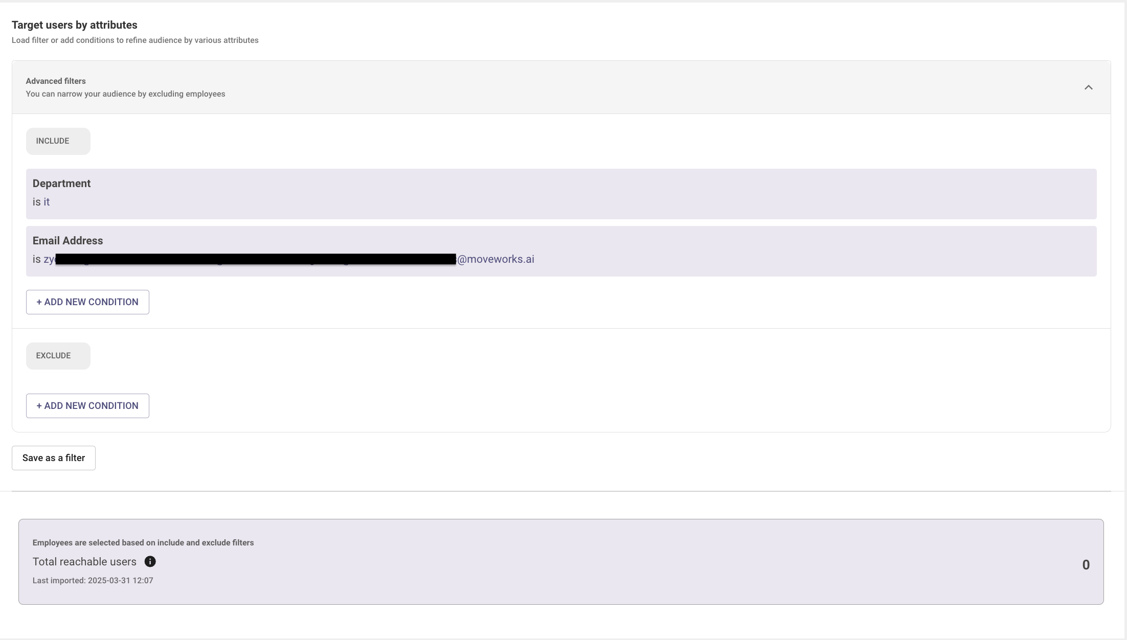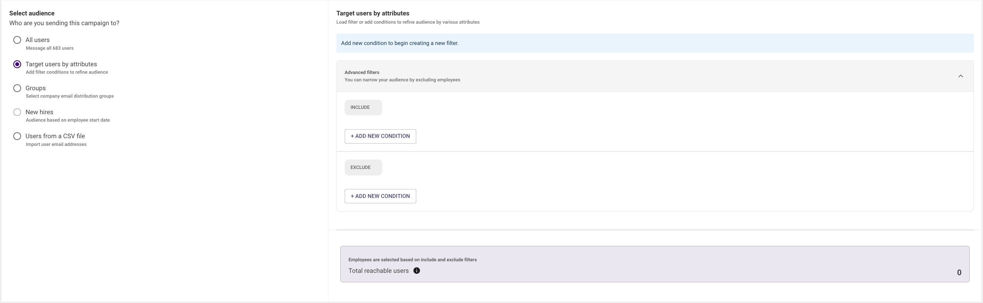 This option is used to filter out which users the campaign will reach. You can create filters by leveraging ingested user attributes such as department, location, or other user meta data. This can be done by clicking on Advanced filters, then + Add New Condition by picking from the list of attributes to include or exclude users with this attribute from receiving the message.