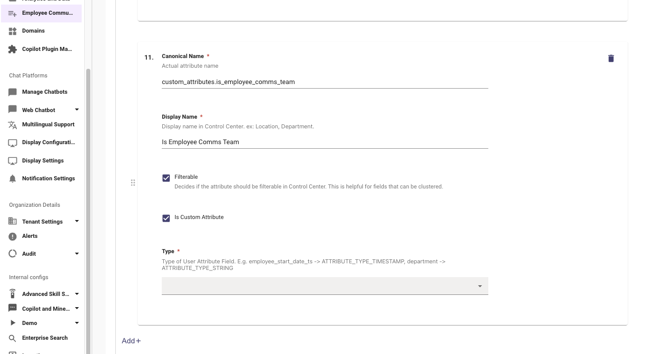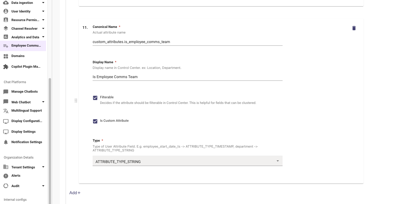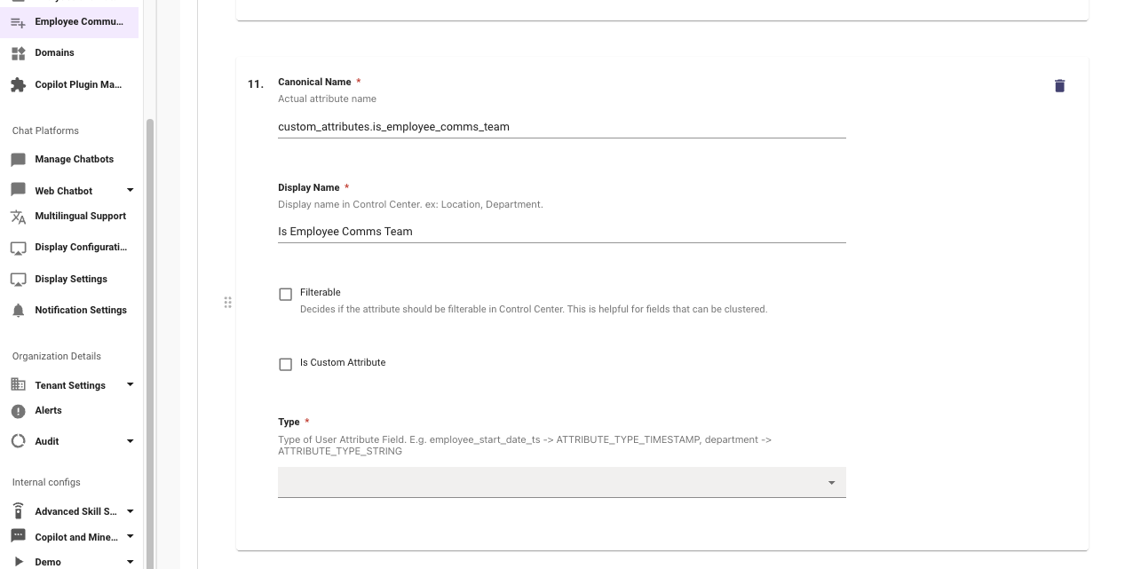 Note: The attributes available come from the applications that have been integrated with your Moveworks AI Assistant. To add more attributes, please ensure the Attribute is part of the list of user attributes supported by Moveworks which is defined here and you can then follow this guide on How to create a Custom Attribute if one does not exist in the list.