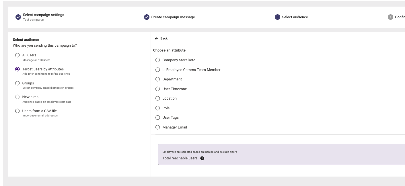Once the preview has been tested we can move to the Select Audience step. This is where Moveworks builds the audience of employees that will be selected to deliver the communications. This configuration is essential to make sure that the right set of people receive the message at the selected date and time.