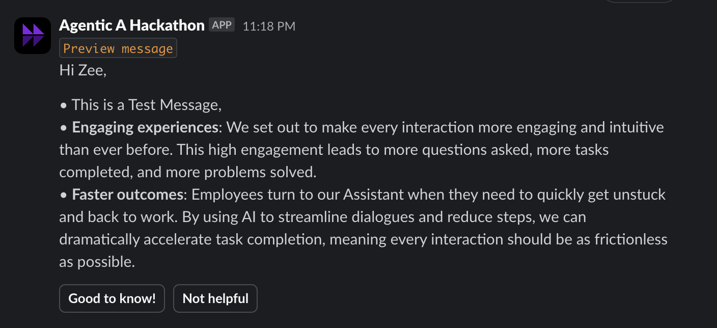 You cannot progress without previewing your message in Moveworks AI AssistantAny interactions with the preview message are not recorded for the purposes of analytics.
