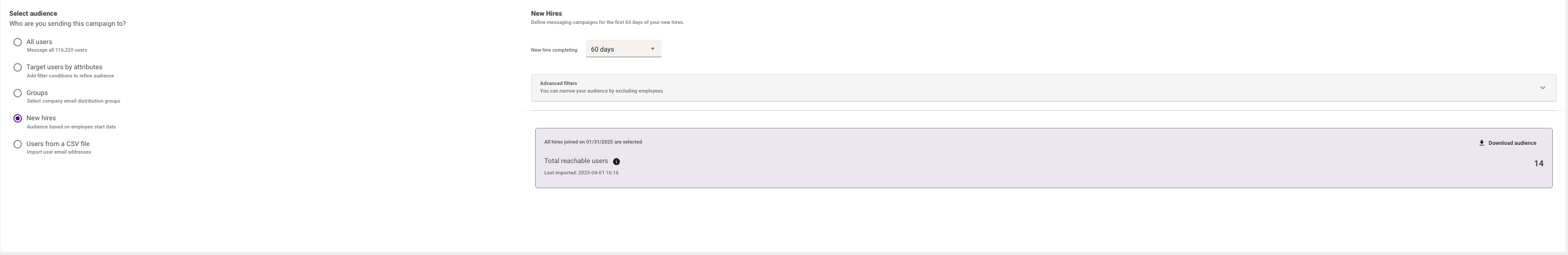 New hires will receive the message on the next day of completing the specified number of days in the organisation. Example: If the selected audience is new hires completing 4 days then they will receive the message on their 5th day.