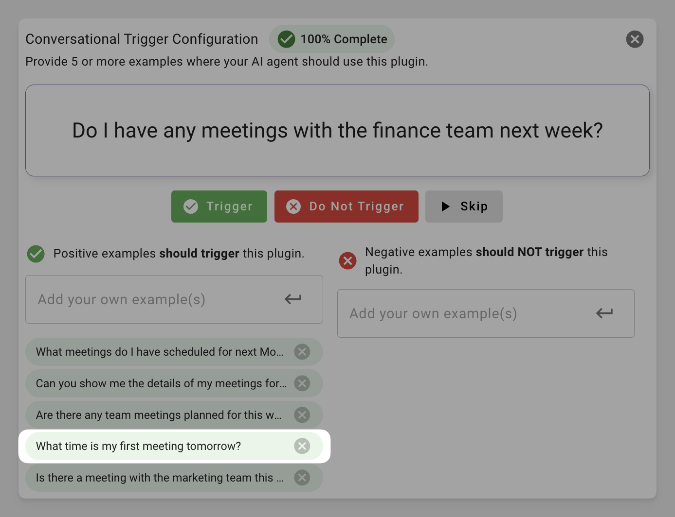 - Triggering Examples – these help your Conversational AI agent shortlist which plugins are most relevant