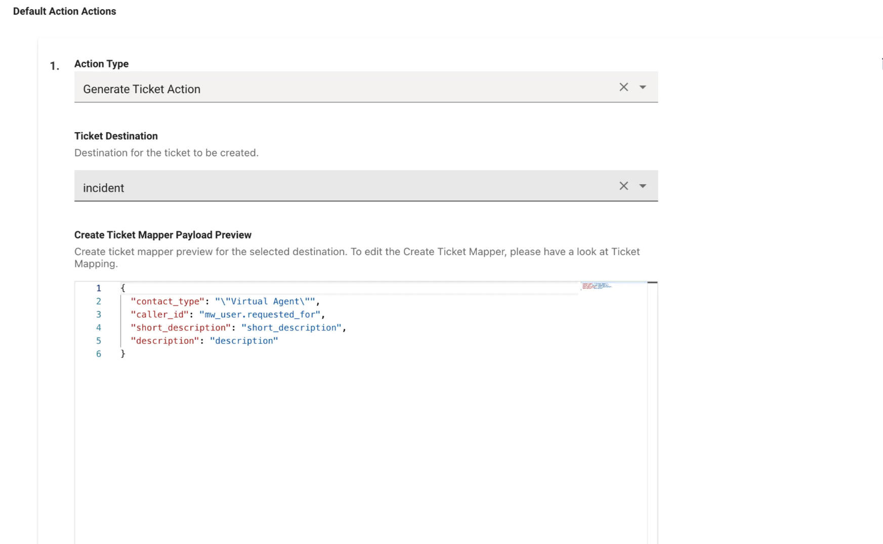 When you create a new Workflow, the Default Action will define the Generate Ticket Action with the default payload which has been set for a Destination.