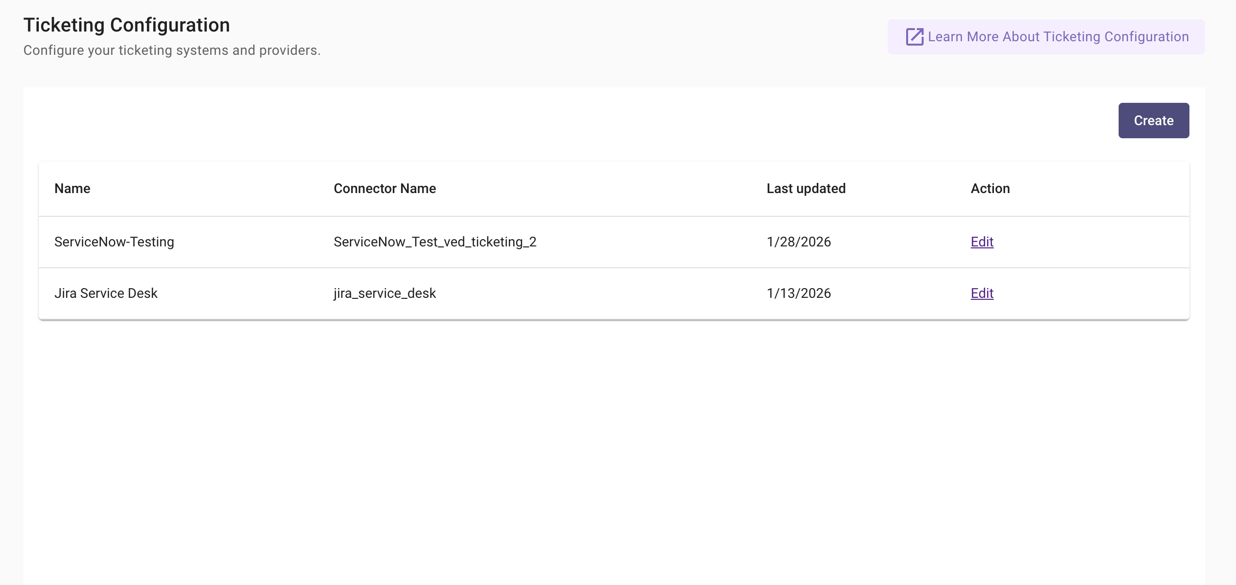 Start by navigating to Ticketing Automation > Ticketing Configuration, where you can create and manage ticketing configurations for ServiceNow. If you are configuring ticketing for the first time or adding a new ticketing system, click Create to set up a new ticketing configuration.
