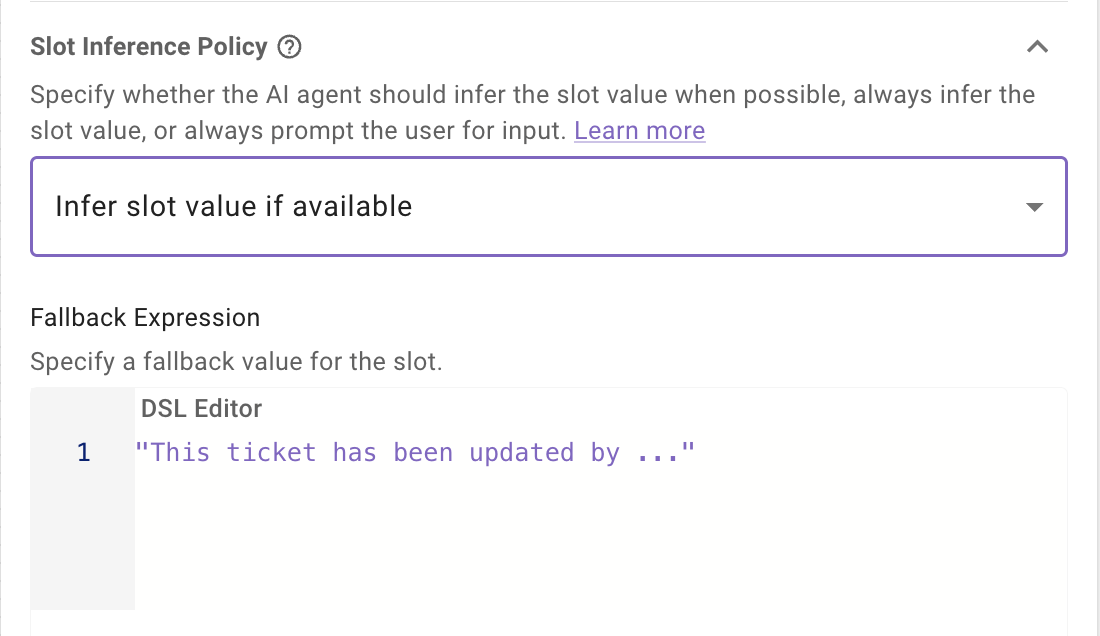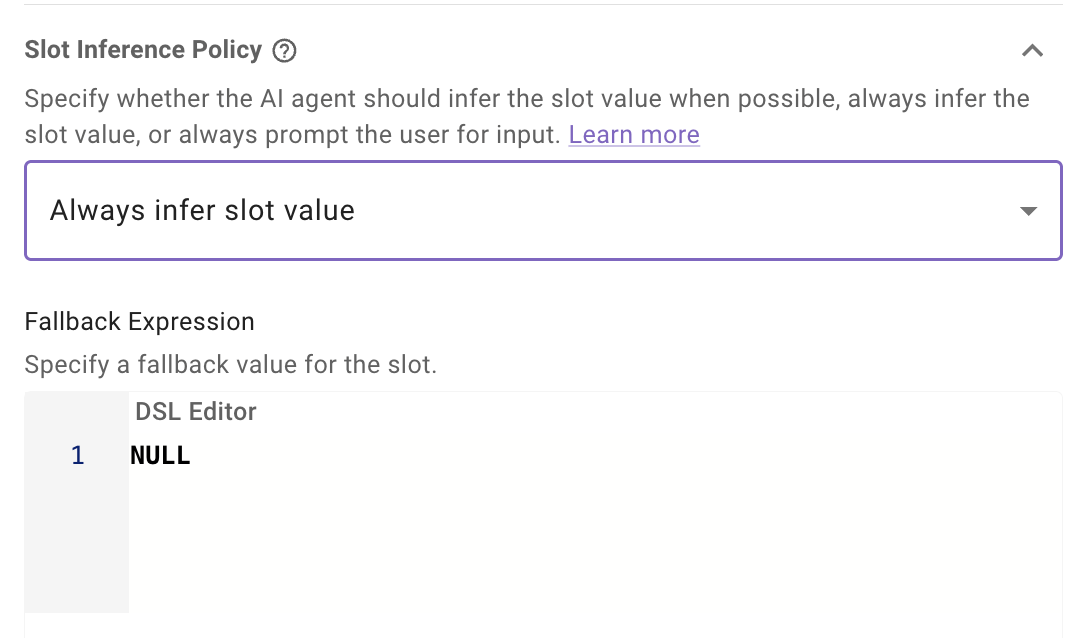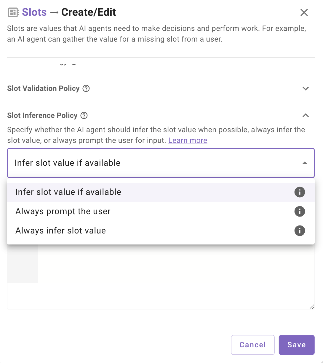 The Slot Inference Policy determines how the reasoning engine gathers values for a slot. Configure this setting when creating or editing a slot.