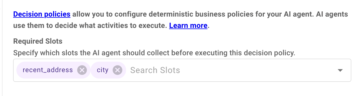 - Same activity/decision policy: If both slots are required by the same activity or decision policy, the dependency slot must appear to the left in the Required Slots list.