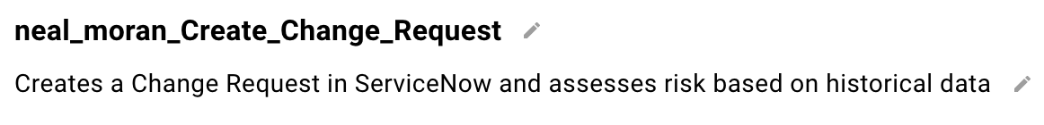 Or copy paste from here: firstname_lastname_create_change_request Creates a Change Request in ServiceNow and assesses risk based on historical data