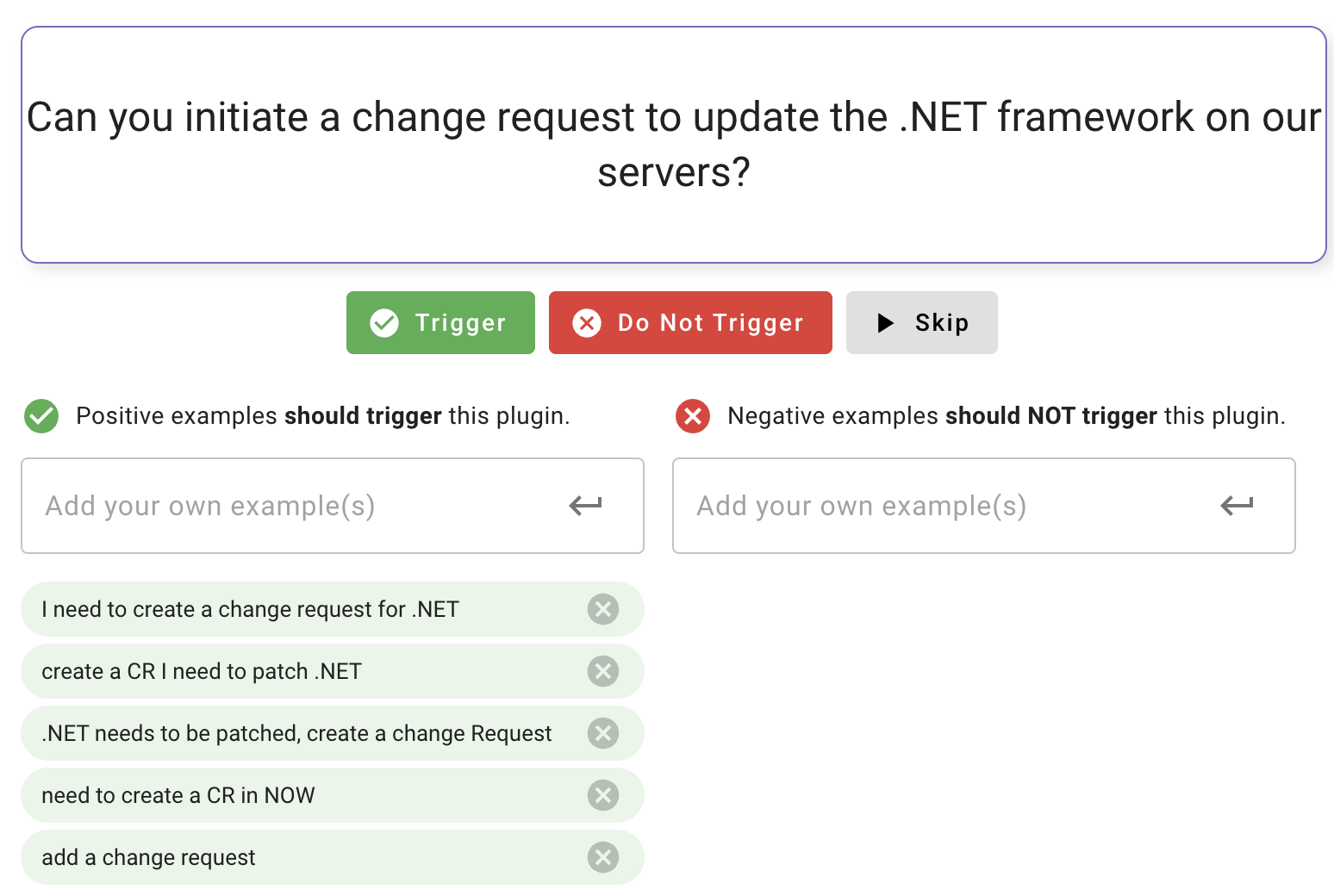 On the “Plugin Editor” tab, click the “Conversational” tile in the "Trigger" block. On the right you will see a dialog to provide examples of utterances that should trigger this plugin.