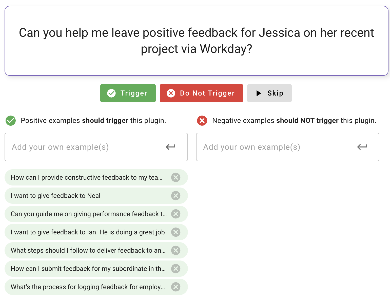 Some examples will be provided for you. If they look good, choose the green “Trigger” button or skip it and provide some of your own. You need at least 5 examples in order to proceed. Once you have 5, click “Save Draft”.