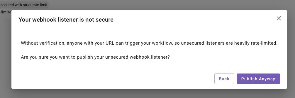 Note: Unsecured listeners are intended for testing only. For production environments, always enable signature verification to secure your webhook listener.