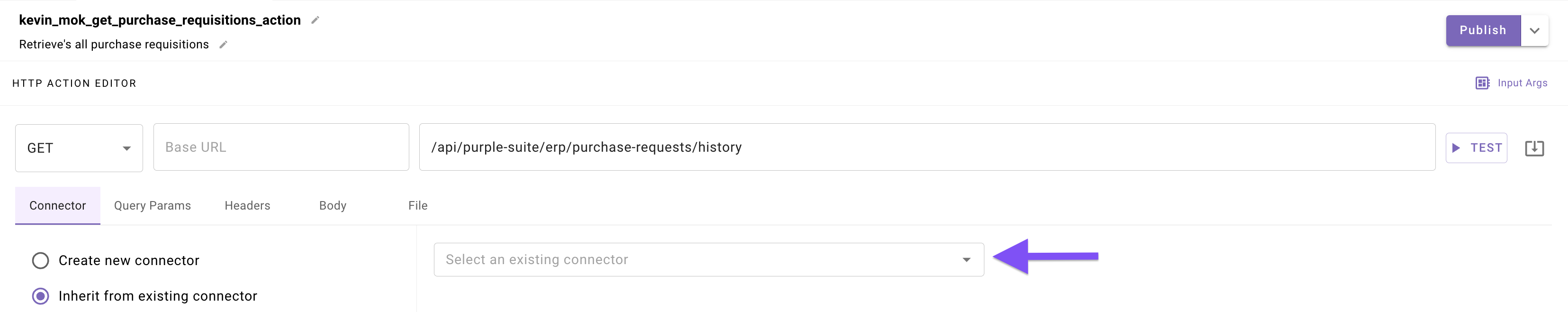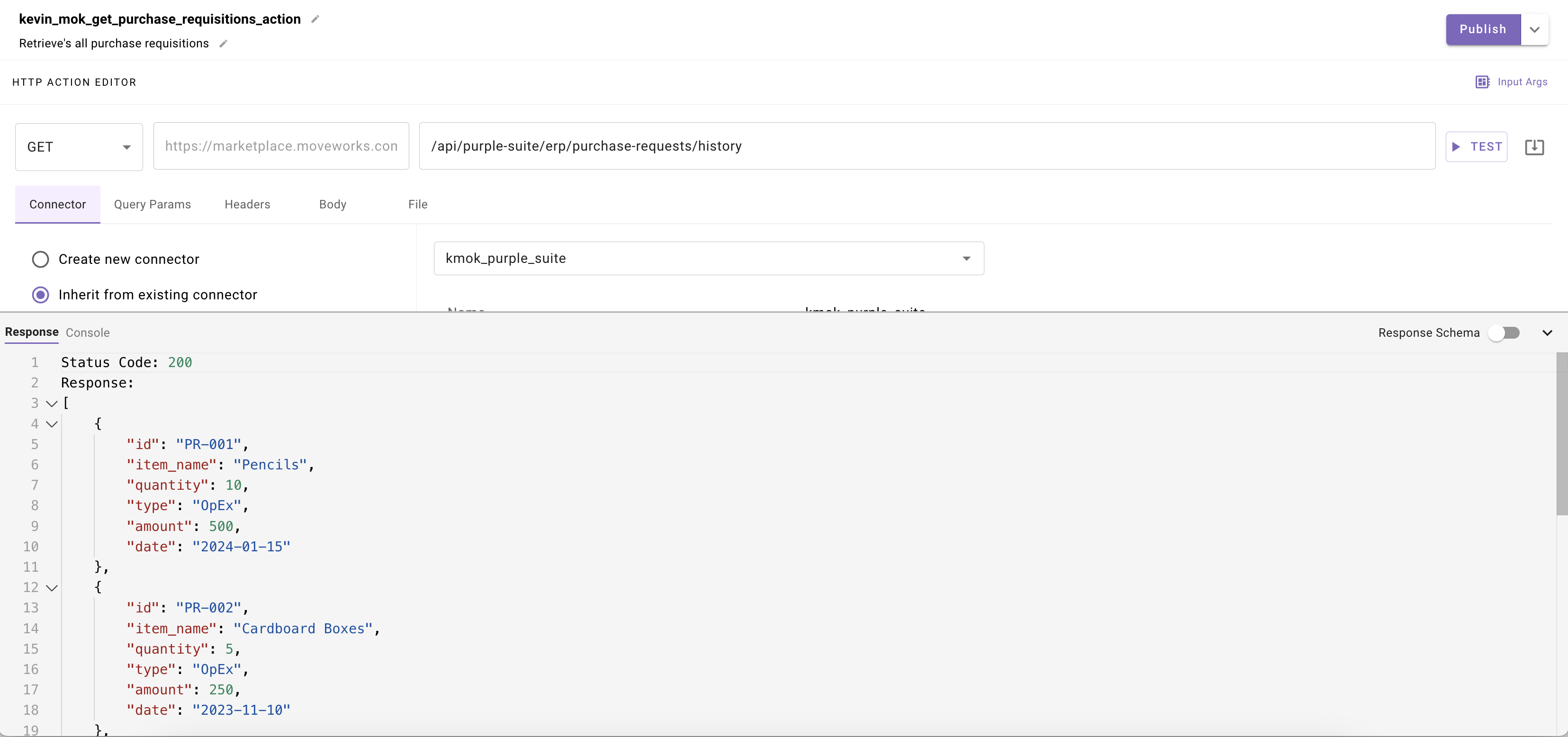In this guide, the purchase requisition data that your Action will access lives behind the Moveworks Purple API Connector. To access this data via your Action, you need to set up a (reusable) connector: