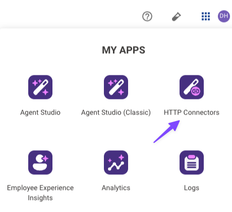 - Navigate to the App Picker in the top right corner of Agent Studio.