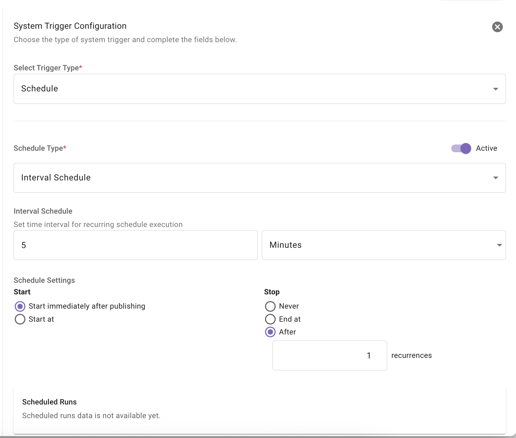 (or whatever you want for testing) Minimum 1 minute*Schedule Settings Start: Start Immediately after published