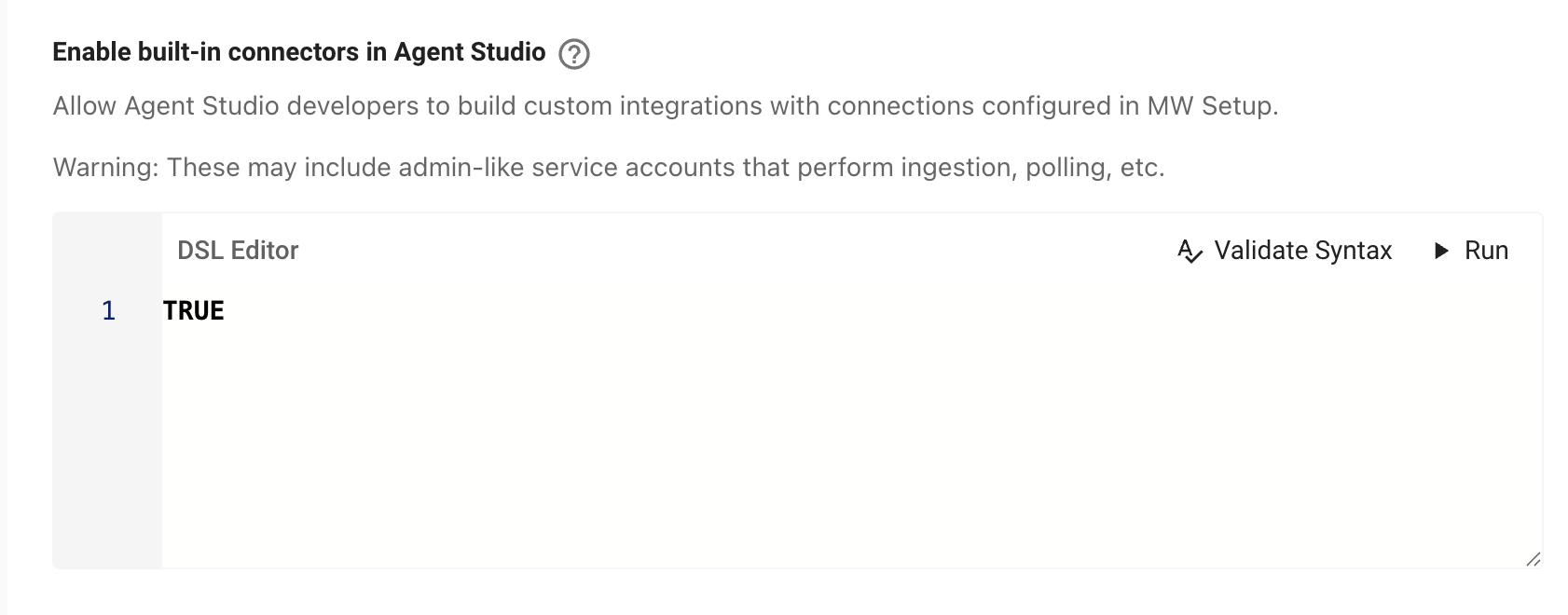 - When the DSL rule is TRUE for a user, built-in connectors become selectable in Agent Studio.