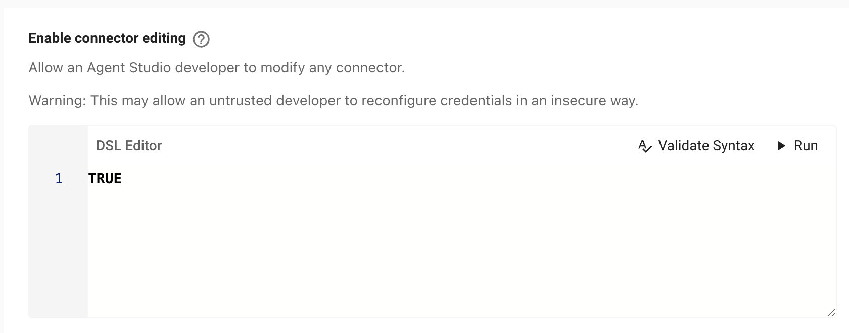 - When the DSL rule evaluates to TRUE for a user, they can edit any HTTP connector referenced by their work in Agent Studio.