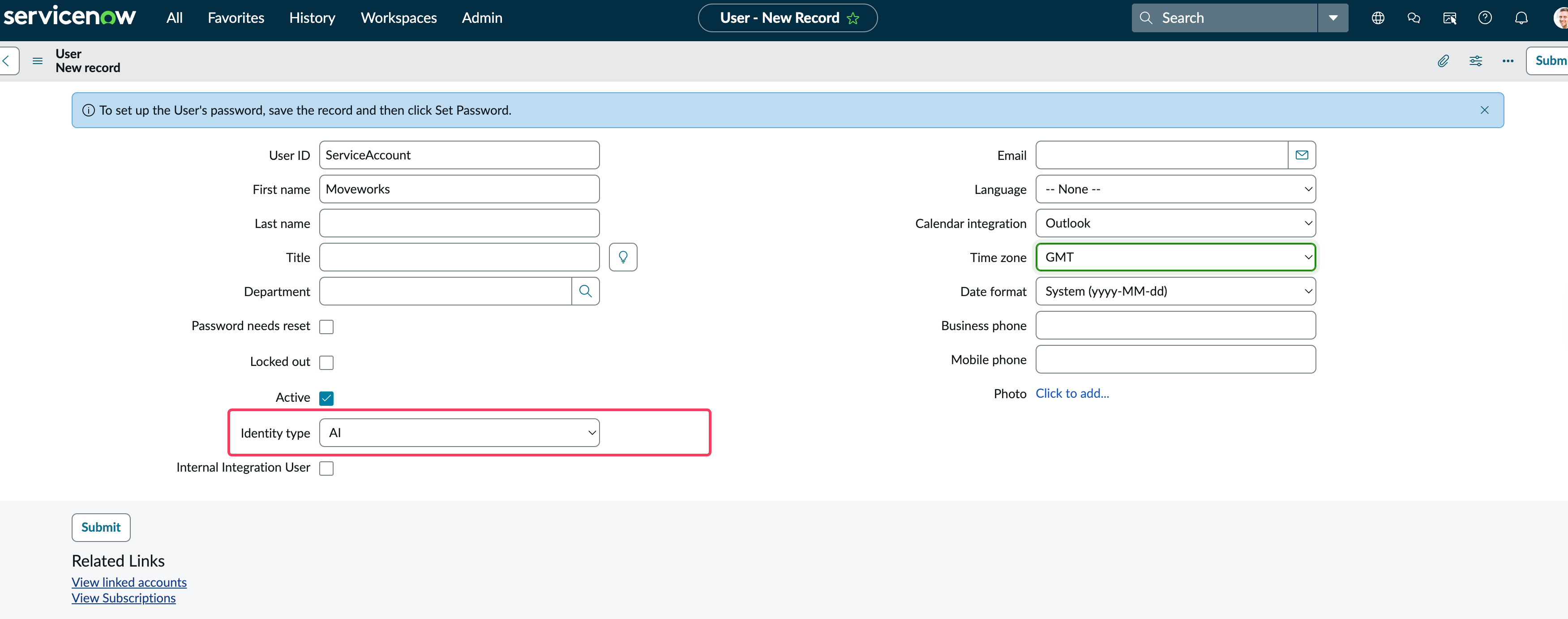 If you are using the latest release of ServiceNow starting from Yokohama patch 6 to Zurich you will see a new identity type field. Please select the identity type to be AI in this case