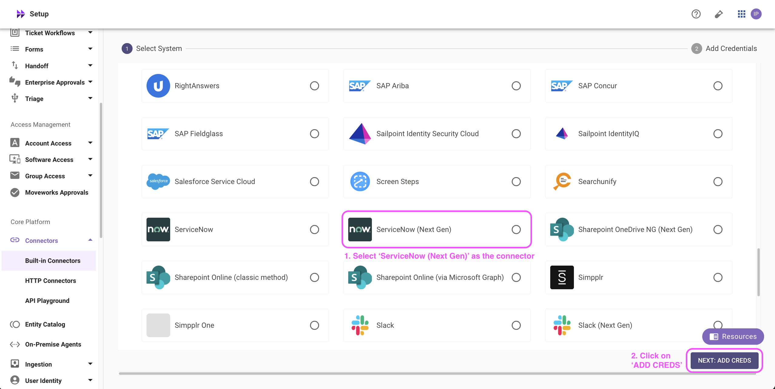 Please note: Only the ServiceNow (Next Gen) connectors will appear in this list.