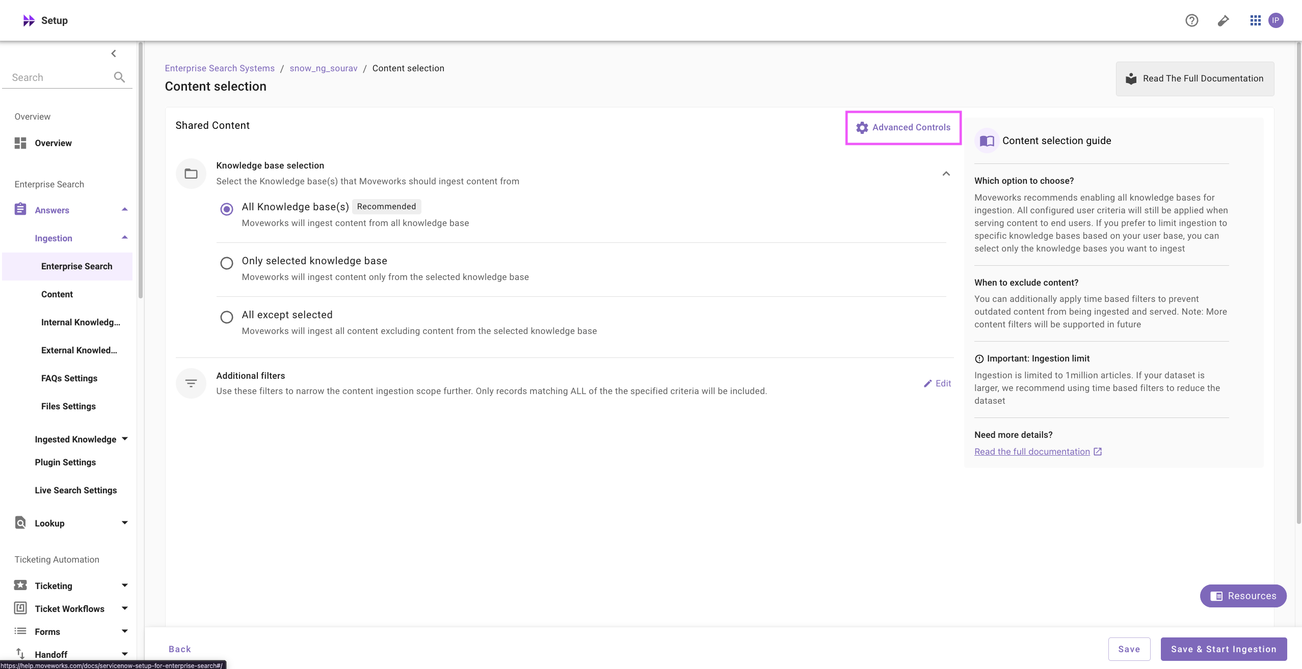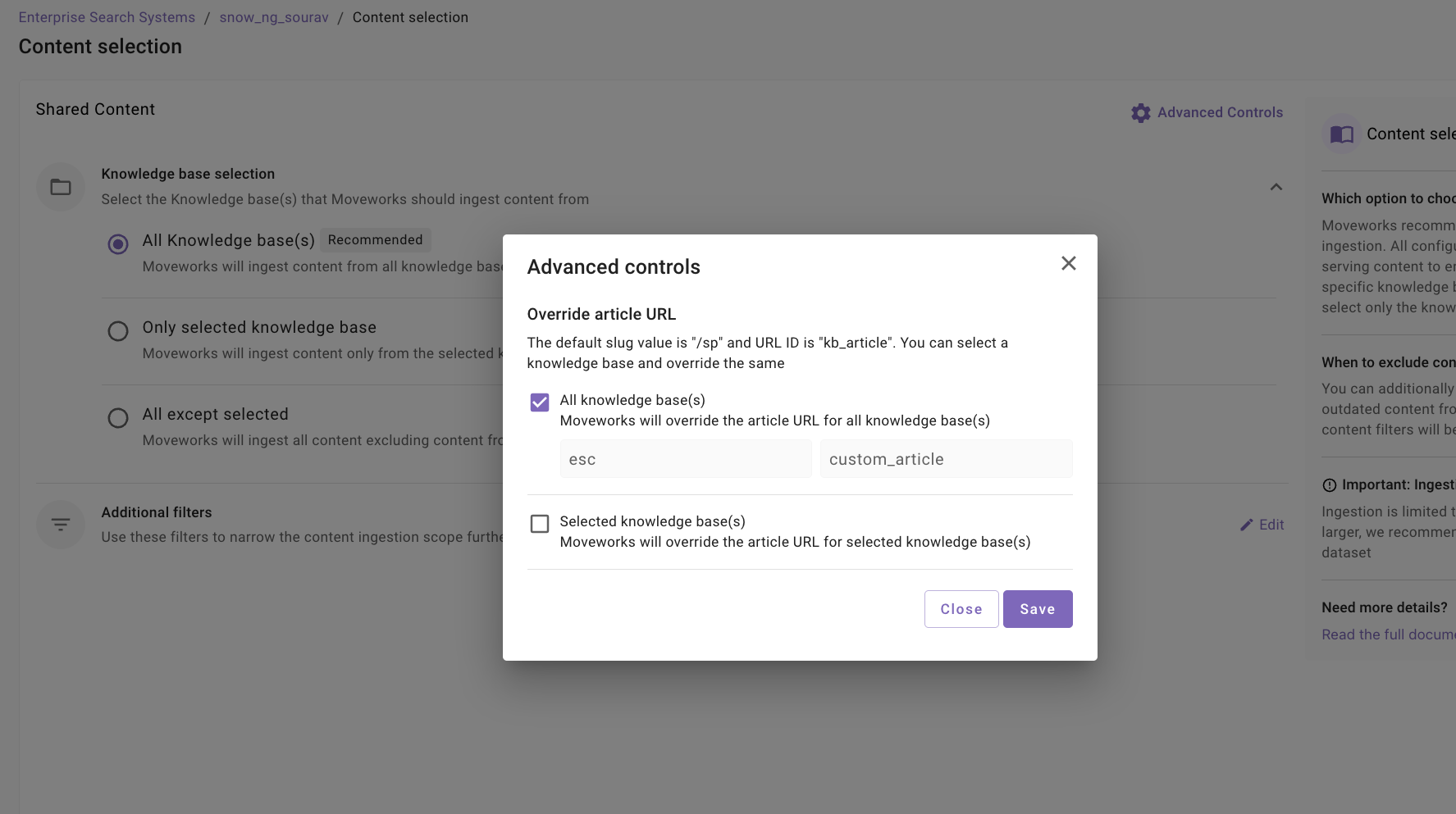 Only selected knowledge base : Moveworks will ingest content only from the selected knowledge base